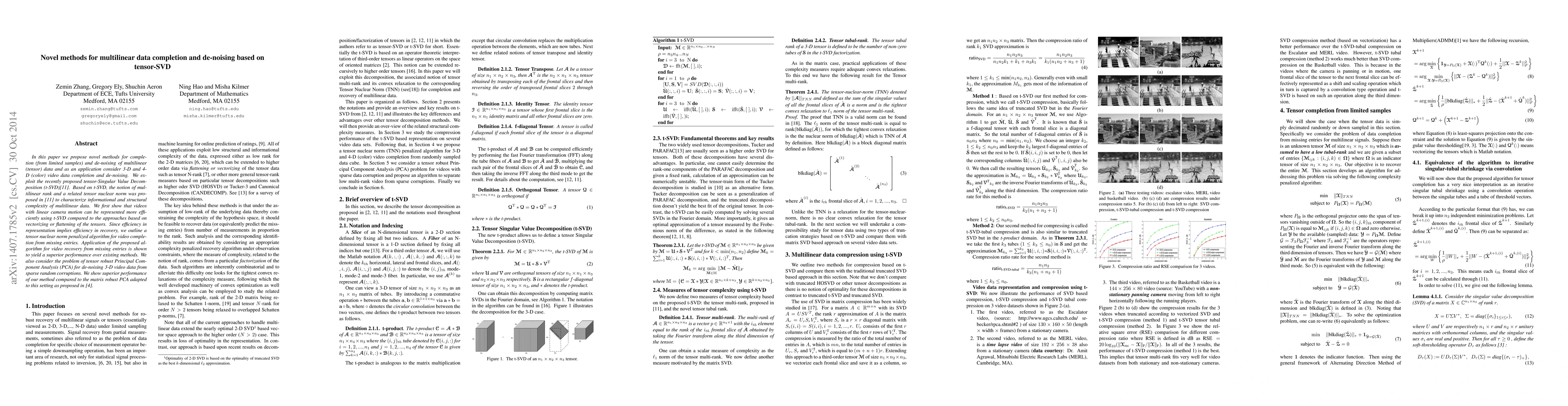 This paper introduces novel methods for multilinear data completion and de-noising using tensor-SVD, demonstrating superior performance in 3-D and 4-D video data recovery compared to existing techniques. The proposed tensor nuclear norm penalized algorithm outperforms matrix-based methods for video completion and de-noising.