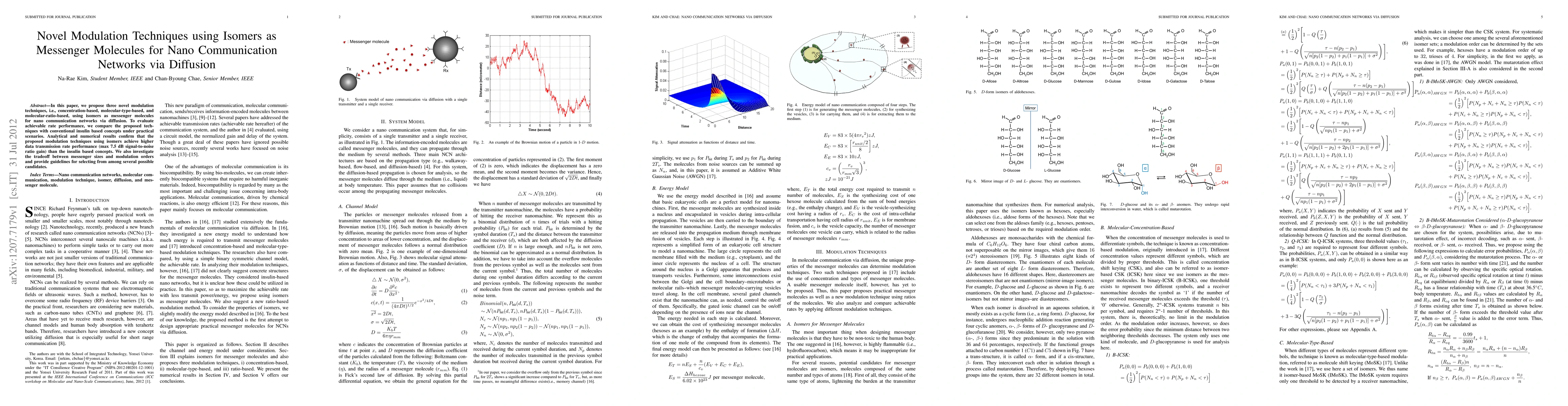 In this paper, we propose three novel modulation techniques, i.e., concentration-based, molecular-type-based, and molecular-ratio-based, using isomers as messenger molecules for nano communication networks via diffusion. To evaluate achievable rate performance, we compare the proposed tech- niques with conventional insulin based concepts under practical scenarios. Analytical and numerical results confirm that the proposed modulation techniques using isomers achieve higher data transmission rate performance (max 7.5 dB signal-to-noise ratio gain) than the insulin based concepts. We also investigate the tradeoff between messenger sizes and modulation orders and provide guidelines for selecting from among several possible candidates.