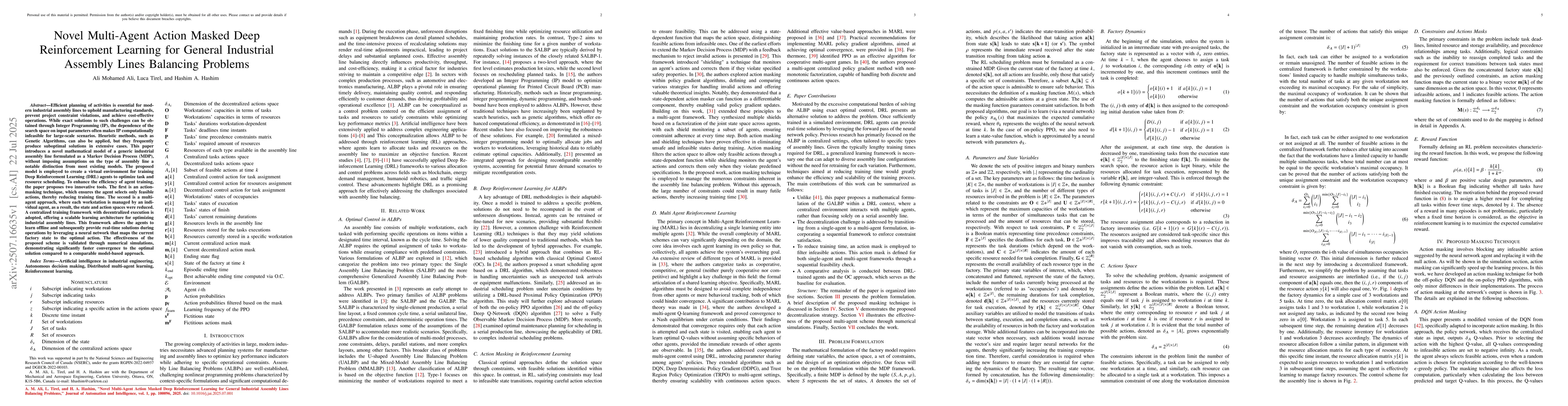 The paper presents a novel mathematical model of a generic industrial assembly line formulated as a Markov Decision Process (MDP), employing Deep Reinforcement Learning (DRL) agents for task and resource scheduling optimization. Two innovative tools are introduced: an action-masking technique to ensure feasible actions and a multi-agent approach for reducing state and action spaces.