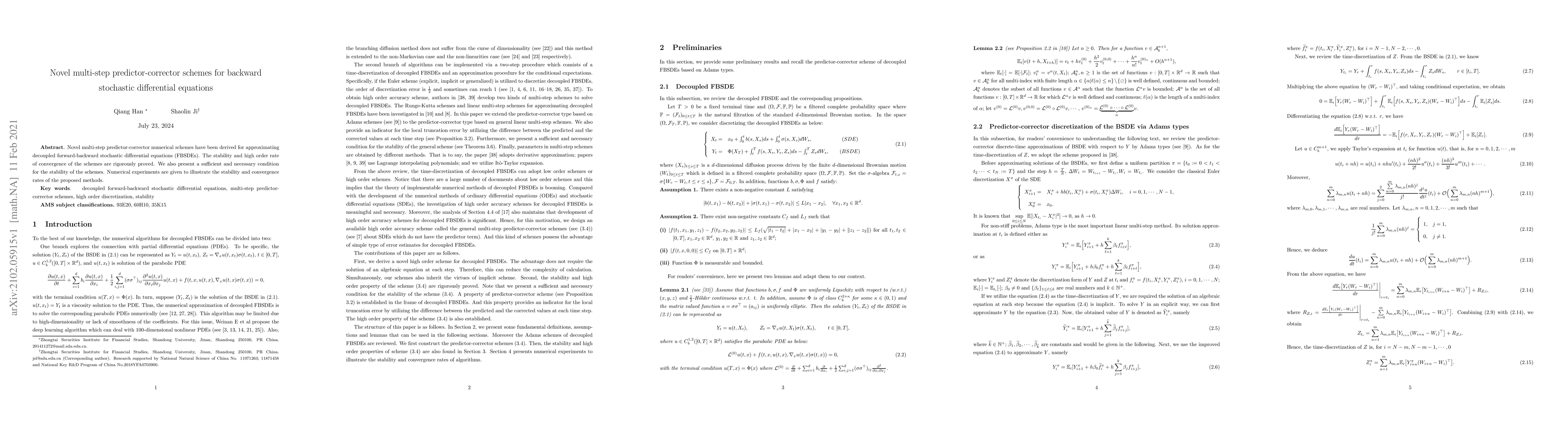 This paper introduces new multi-step predictor-corrector schemes for solving decoupled forward-backward stochastic differential equations (FBSDEs), proving their stability and high-order convergence rates. It also provides a condition for scheme stability and demonstrates the methods through numerical experiments.