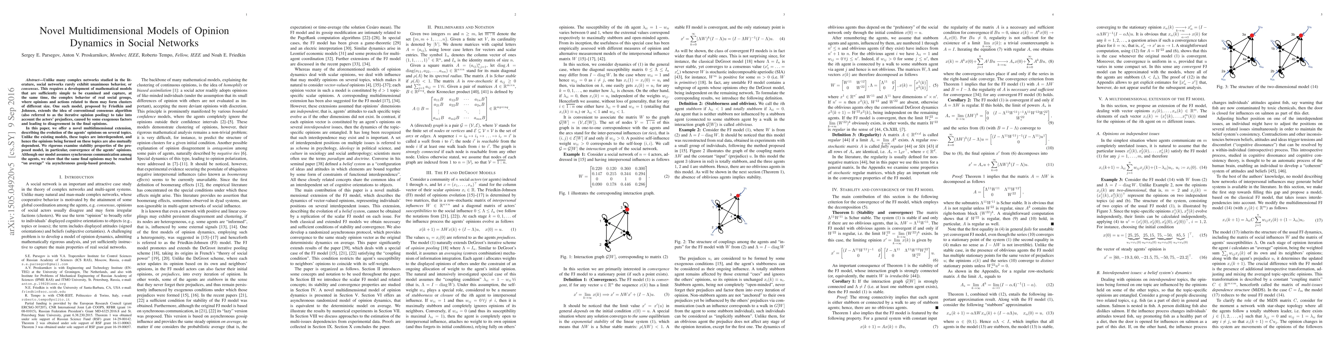 Unlike many complex networks studied in the literature, social networks rarely exhibit unanimous behavior, or consensus. This requires a development of mathematical models that are sufficiently simple to be examined and capture, at the same time, the complex behavior of real social groups, where opinions and actions related to them may form clusters of different size. One such model, proposed by Friedkin and Johnsen, extends the idea of conventional consensus algorithm (also referred to as the iterative opinion pooling) to take into account the actors' prejudices, caused by some exogenous factors and leading to disagreement in the final opinions. In this paper, we offer a novel multidimensional extension, describing the evolution of the agents' opinions on several topics. Unlike the existing models, these topics are interdependent, and hence the opinions being formed on these topics are also mutually dependent. We rigorous examine stability properties of the proposed model, in particular, convergence of the agents' opinions. Although our model assumes synchronous communication among the agents, we show that the same final opinions may be reached "on average" via asynchronous gossip-based protocols.