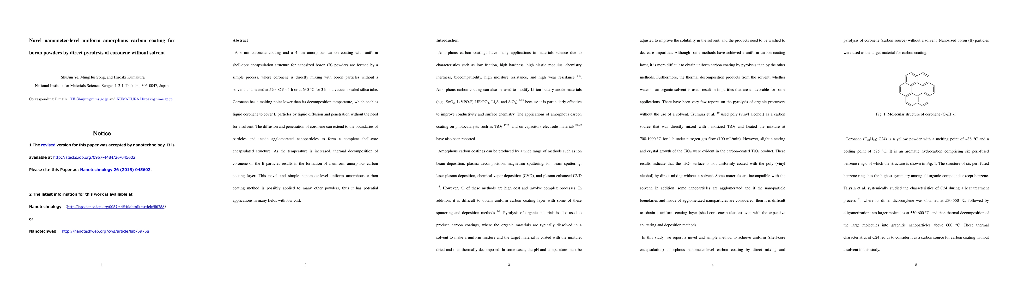 This paper presents a solvent-free method for creating a uniform 3-4 nm amorphous carbon coating on boron powders via direct pyrolysis of coronene at temperatures of 520°C or 630°C. The process involves mixing coronene with boron particles and heating in a vacuum, leading to a complete shell-core encapsulation structure.