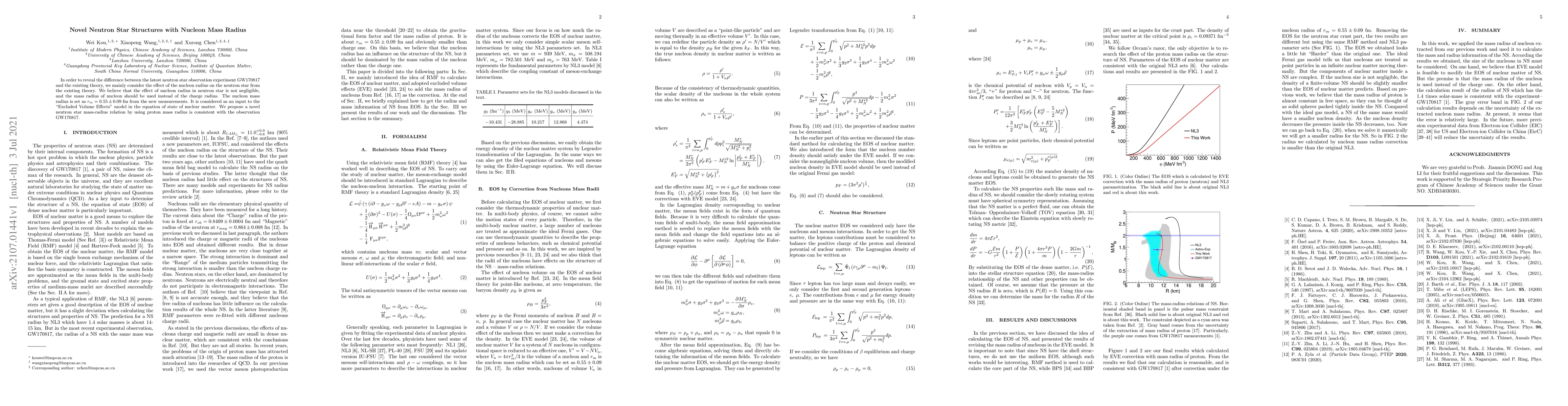 In order to reveal the difference between the latest neutron star observation experiment GW170817 and the existing theory, we mainly consider the effect of the nucleon radius on the neutron star from the existing theory. We believe that the effect of nucleon radius in neutron star is not negligible, and the mass radius of nucleon should be used instead of the charge radius. The nucleon mass radius is set as $r_m = 0.55\pm0.09$ fm from the new measurements. It is considered as an input to the "Excluded Volume Effects" model in the equation of state of nuclear matter. We propose a novel neutron star mass-radius relation by using proton mass radius is consistent with the observation GW170817.