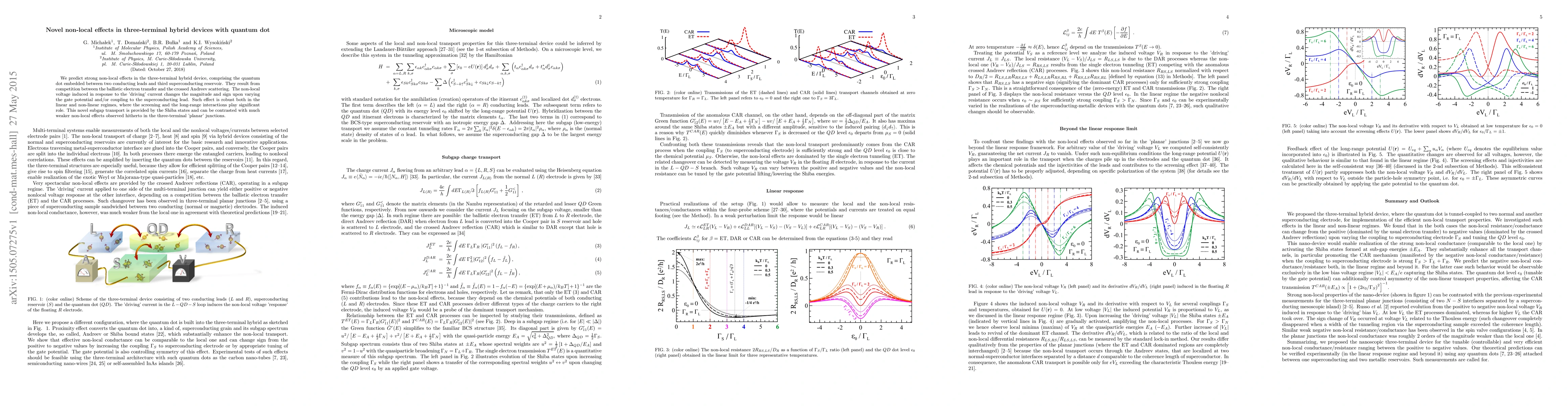 This paper predicts strong non-local effects in three-terminal hybrid devices with a quantum dot, driven by competition between ballistic electron transfer and crossed Andreev scattering. The non-local voltage response is robust and changes with gate potential and superconducting coupling, contrasting with weaker effects in planar junctions.