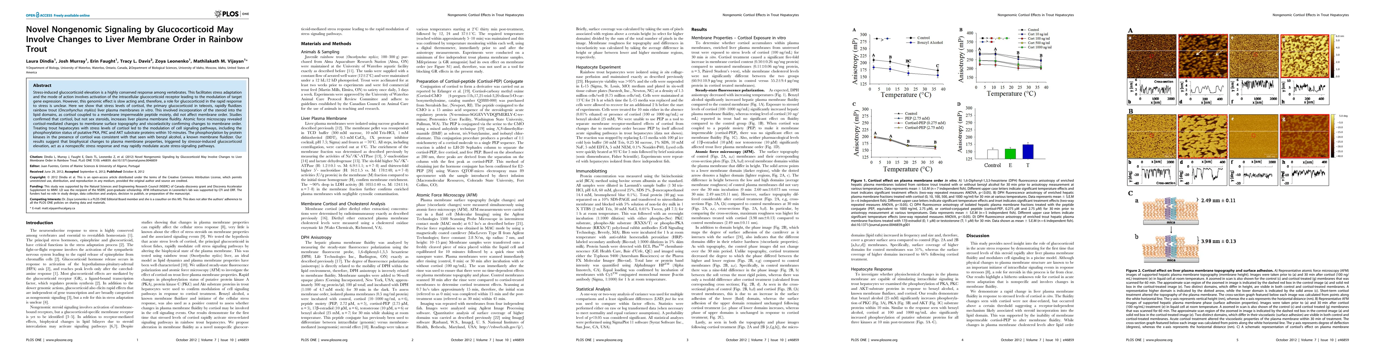 This study reveals that stress-induced cortisol elevates liver membrane fluidity in rainbow trout, suggesting a nongenomic signaling pathway. Rapid changes in membrane order and surface topography modulate signaling pathways within minutes, indicating a nonspecific stress response mechanism.