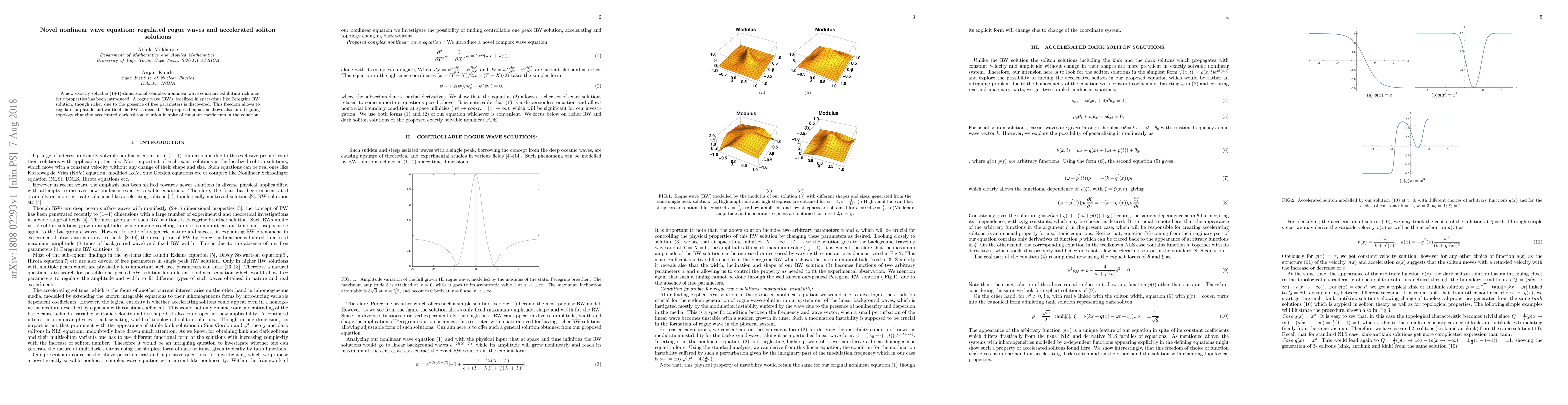 A new exactly solvable (1+1)-dimensional complex nonlinear wave equation exhibiting rich ana- lytic properties has been introduced. A rogue wave (RW), localized in space-time like Peregrine RW solution, though richer due to the presence of free parameters is discovered. This freedom allows to regulate amplitude and width of the RW as needed. The proposed equation allows also an intriguing topology changing accelerated dark soliton solution in spite of constant coefficients in the equation.