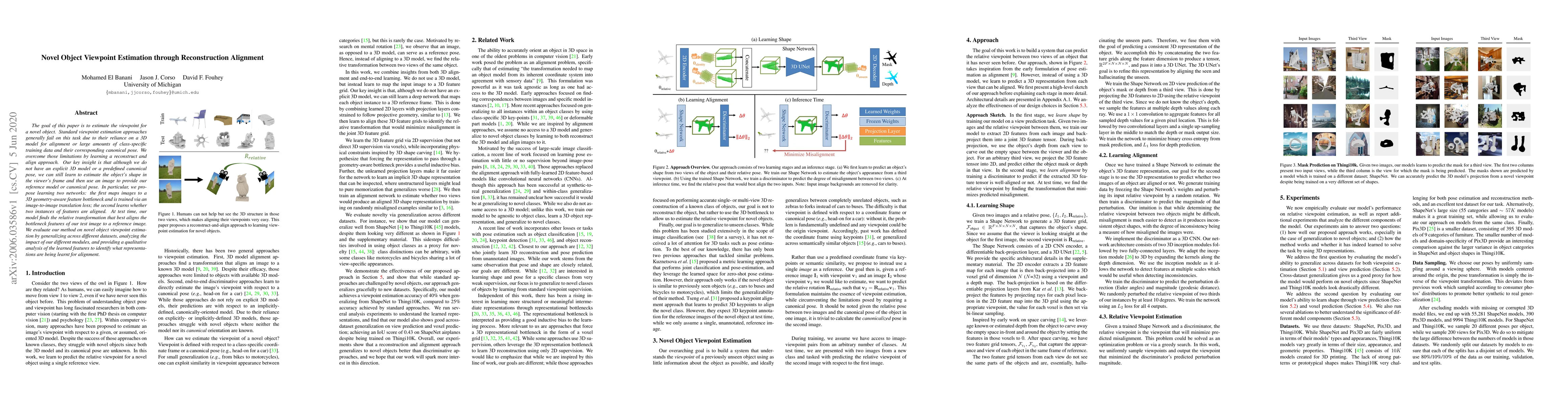 The goal of this paper is to estimate the viewpoint for a novel object. Standard viewpoint estimation approaches generally fail on this task due to their reliance on a 3D model for alignment or large amounts of class-specific training data and their corresponding canonical pose. We overcome those limitations by learning a reconstruct and align approach. Our key insight is that although we do not have an explicit 3D model or a predefined canonical pose, we can still learn to estimate the object's shape in the viewer's frame and then use an image to provide our reference model or canonical pose. In particular, we propose learning two networks: the first maps images to a 3D geometry-aware feature bottleneck and is trained via an image-to-image translation loss; the second learns whether two instances of features are aligned. At test time, our model finds the relative transformation that best aligns the bottleneck features of our test image to a reference image. We evaluate our method on novel object viewpoint estimation by generalizing across different datasets, analyzing the impact of our different modules, and providing a qualitative analysis of the learned features to identify what representations are being learnt for alignment.