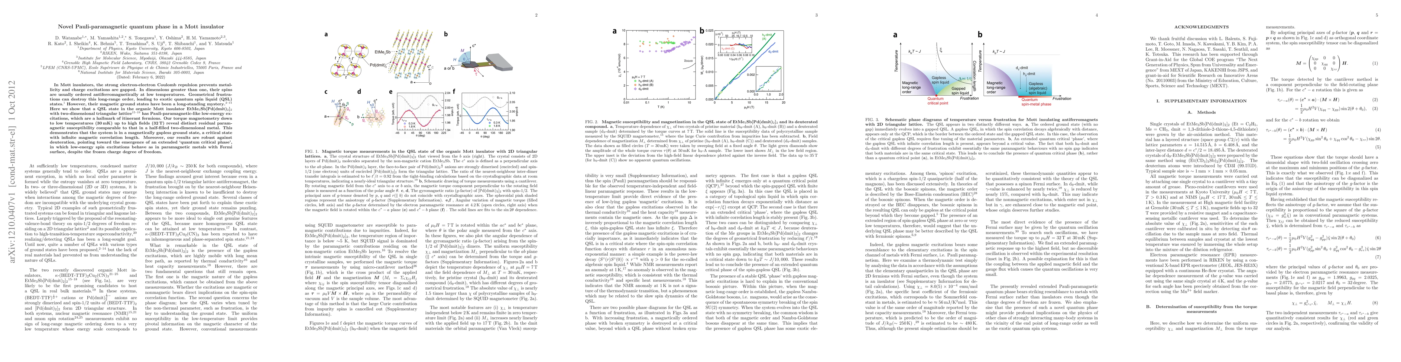 This paper reveals a novel Pauli-paramagnetic quantum phase in a Mott insulator, specifically in the organic compound EtMe$_3$Sb[Pd(dmit)$_2$]$_2$, characterized by itinerant fermion-like spin excitations despite the absence of charge excitations. The study demonstrates a magnetically gapless ground state with infinite correlation length, suggesting an extended quantum critical phase.