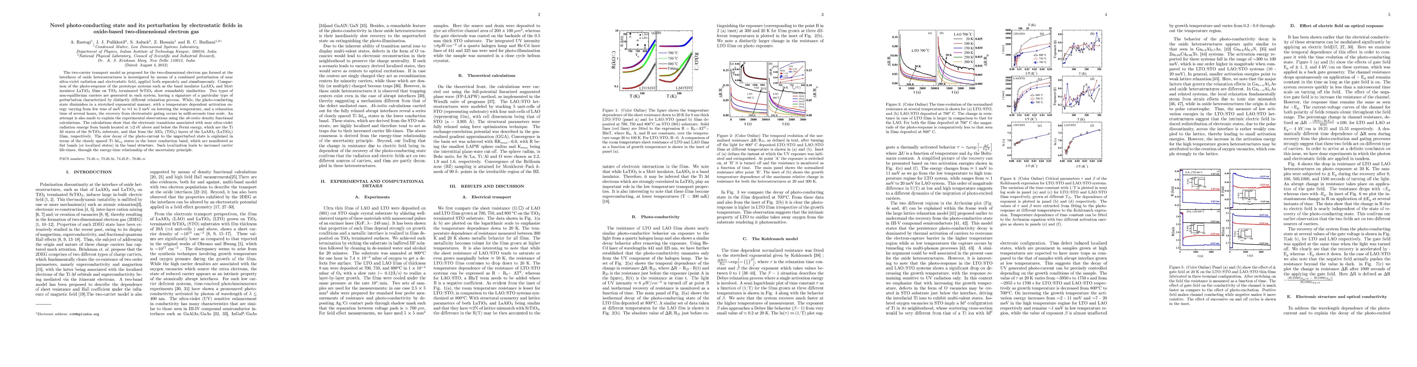 The two-carrier transport model as proposed for the two-dimensional electron gas formed at the interfaces of oxide heterostructures is investigated by means of a combined perturbation of near ultra-violet radiation and electrostatic field, applied both separately and simultaneously. Comparison of the photo-response of the prototype systems such as the band insulator LaAlO3 and Mott insulator LaTiO3 films on TiO2 terminated SrTiO3 show remarkably similarities. Two types of non-equilibrium carriers are generated in each system, having a signature of a particular type of perturbation characterized by distinctly different relaxation process. While, the photo-conducting state diminishes in a stretched exponential manner, with a temperature dependent activation energy varying from few tens of meV to ~ 1 to 2 meV on lowering the temperature, and a relaxation time of several hours, the recovery from electrostatic gating occurs in milli-seconds time scale. An attempt is also made to explain the experimental observations using the ab-initio density functional calculations. The calculations show that the electronic transitions associated with near ultra-violet radiation emerge from bands located at ~ 2 eV above and below the Fermi energy, which are the Ti 3d states of the SrTiO3 substrate, and that from the AlO2 (TiO2) layers of the LaAlO3 (LaTiO3) films, respectively. The slow decay of the photo-current to the unperturbed state is explained in terms of the closely spaced Ti 3dxy states in the lower conduction band, which are manifested as flat bands (or localized states) in the band structure. Such localization leads to increased carrier life-times, through the energy-time relationship of the uncertainty principle.