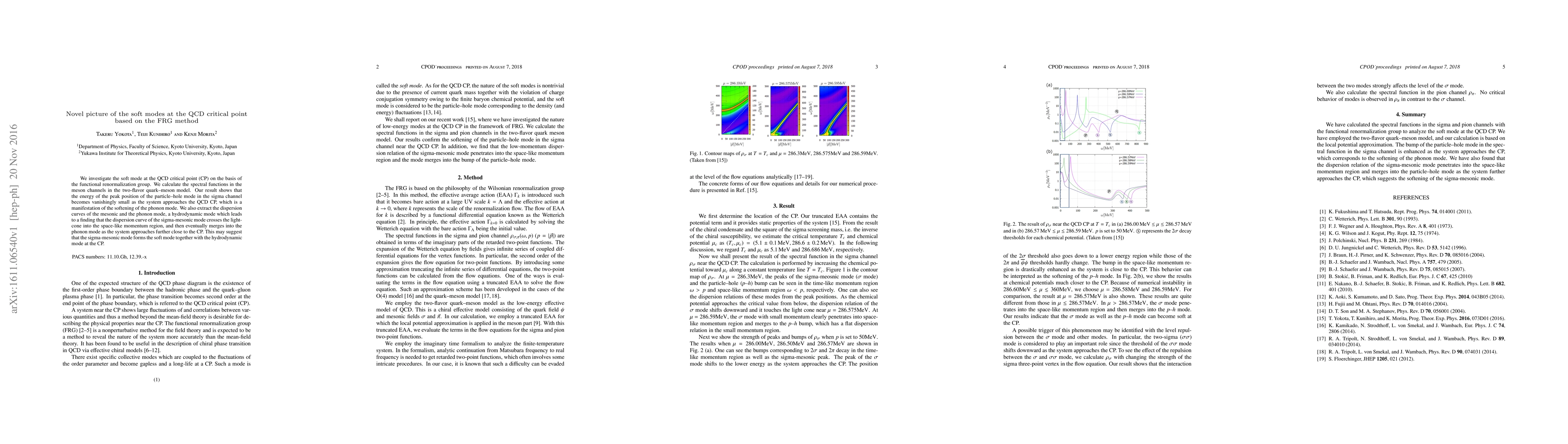 This study employs the functional renormalization group to explore soft modes near the QCD critical point, revealing that the peak energy of the particle-hole mode in the sigma channel diminishes as the system nears the critical point. The research also finds that the sigma-mesonic mode merges with the phonon mode, suggesting a combined soft mode formation with the hydrodynamic mode at the critical point.