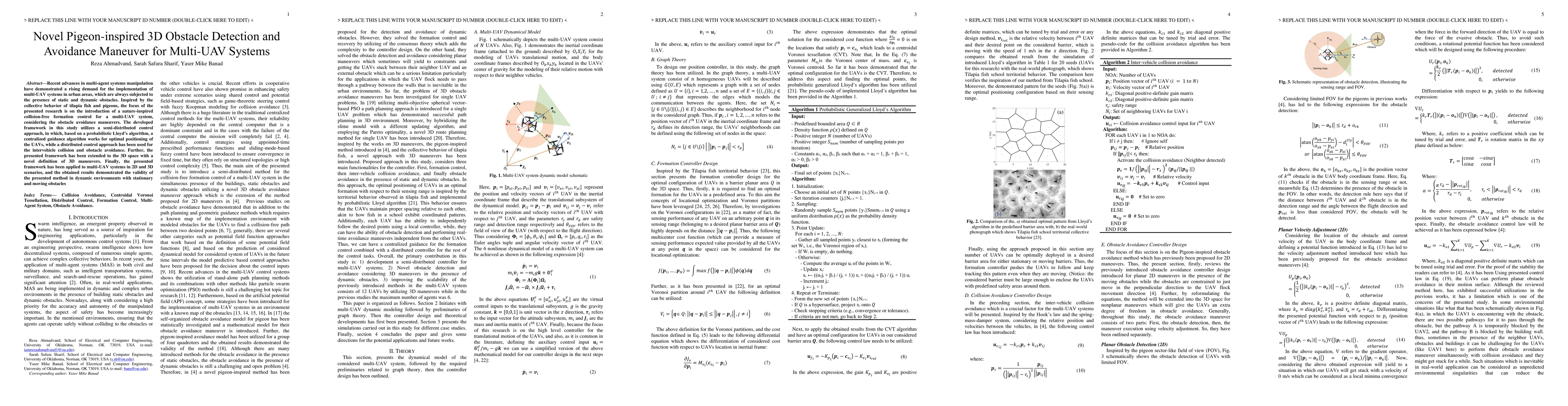 Recent advances in multi-agent systems manipulation have demonstrated a rising demand for the implementation of multi-UAV systems in urban areas, which are always subjected to the presence of static and dynamic obstacles. Inspired by the collective behavior of tilapia fish and pigeons, the focus of the presented research is on the introduction of a nature-inspired collision-free formation control for a multi-UAV system, considering the obstacle avoidance maneuvers. The developed framework in this study utilizes a semi-distributed control approach, in which, based on a probabilistic Lloyd's algorithm, a centralized guidance algorithm works for optimal positioning of the UAVs, while a distributed control approach has been used for the intervehicle collision and obstacle avoidance. Further, the presented framework has been extended to the 3D space with a novel definition of 3D maneuvers. Finally, the presented framework has been applied to multi-UAV systems in 2D and 3D scenarios, and the obtained results demonstrated the validity of the presented method in dynamic environments with stationary and moving obstacles.