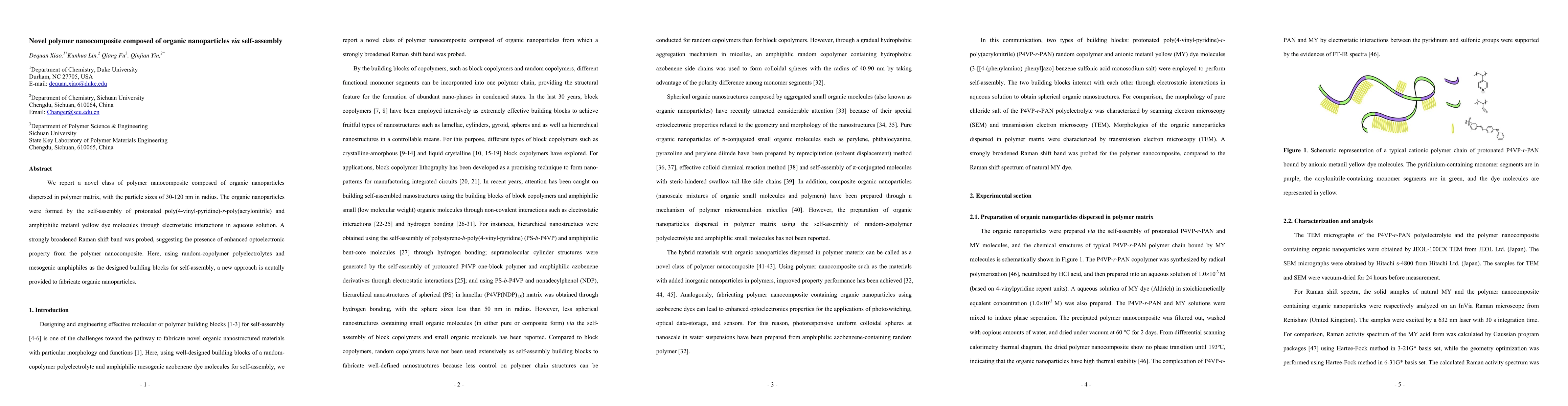 We report a novel class of polymer nanocomposite composed of organic nanoparticles dispersed in polymer matrix, with the particle sizes of 30-120 nm in radius. The organic nanoparticles were formed by the self-assembly of protonated poly(4-vinyl-pyridine)-r-poly(acrylonitrile) and amphiphilic metanil yellow dye molecules through electrostatic interactions in aqueous solution. A strongly broadened Raman shift band was probed, suggesting the presence of enhanced optoelectronic property from the polymer nanocomposite. Here, using random-copolymer polyelectrolytes and mesogenic amphiphiles as the designed building blocks for self-assembly, a new approach is acutally provided to fabricate organic nanoparticles.