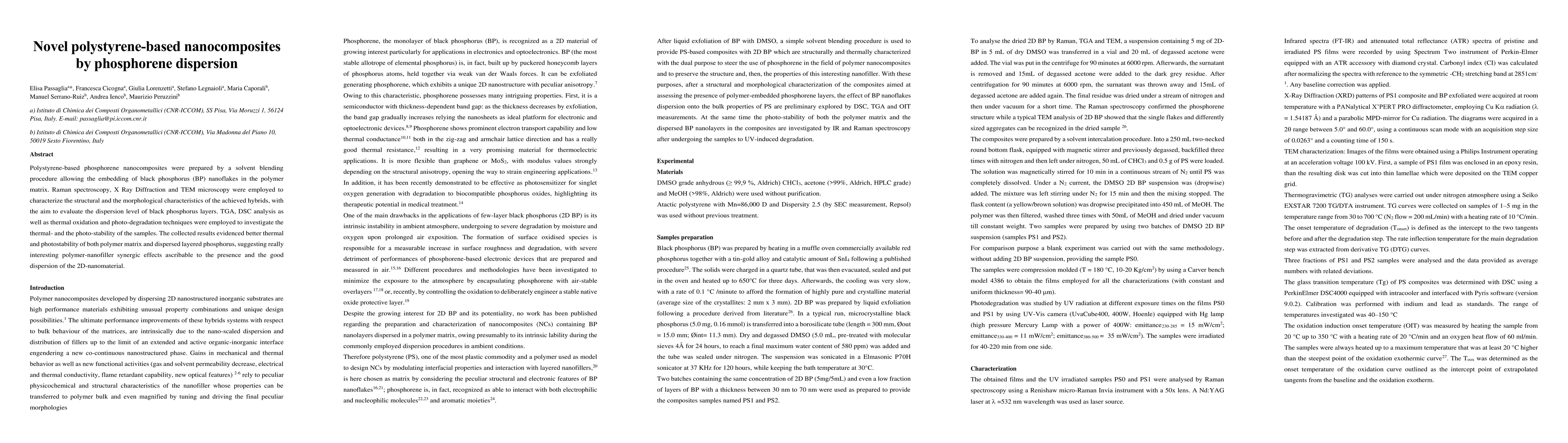 This paper reports on the synthesis of polystyrene-based nanocomposites incorporating phosphorene nanoflakes via solvent blending, characterized by advanced microscopy and spectroscopy techniques. The study finds enhanced thermal and photostability in the nanocomposites, attributing these improvements to the effective dispersion and synergistic effects of the 2D phosphorene nanofiller.
