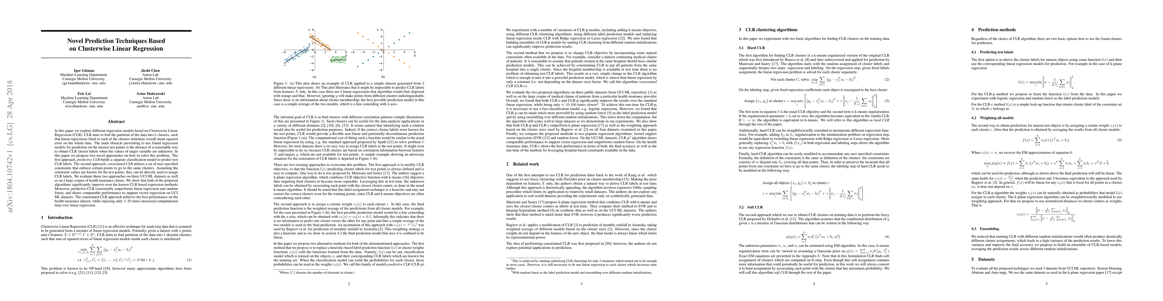 In this paper we explore different regression models based on Clusterwise Linear Regression (CLR). CLR aims to find the partition of the data into $k$ clusters, such that linear regressions fitted to each of the clusters minimize overall mean squared error on the whole data. The main obstacle preventing to use found regression models for prediction on the unseen test points is the absence of a reasonable way to obtain CLR cluster labels when the values of target variable are unknown. In this paper we propose two novel approaches on how to solve this problem. The first approach, predictive CLR builds a separate classification model to predict test CLR labels. The second approach, constrained CLR utilizes a set of user-specified constraints that enforce certain points to go to the same clusters. Assuming the constraint values are known for the test points, they can be directly used to assign CLR labels. We evaluate these two approaches on three UCI ML datasets as well as on a large corpus of health insurance claims. We show that both of the proposed algorithms significantly improve over the known CLR-based regression methods. Moreover, predictive CLR consistently outperforms linear regression and random forest, and shows comparable performance to support vector regression on UCI ML datasets. The constrained CLR approach achieves the best performance on the health insurance dataset, while enjoying only $\approx 20$ times increased computational time over linear regression.