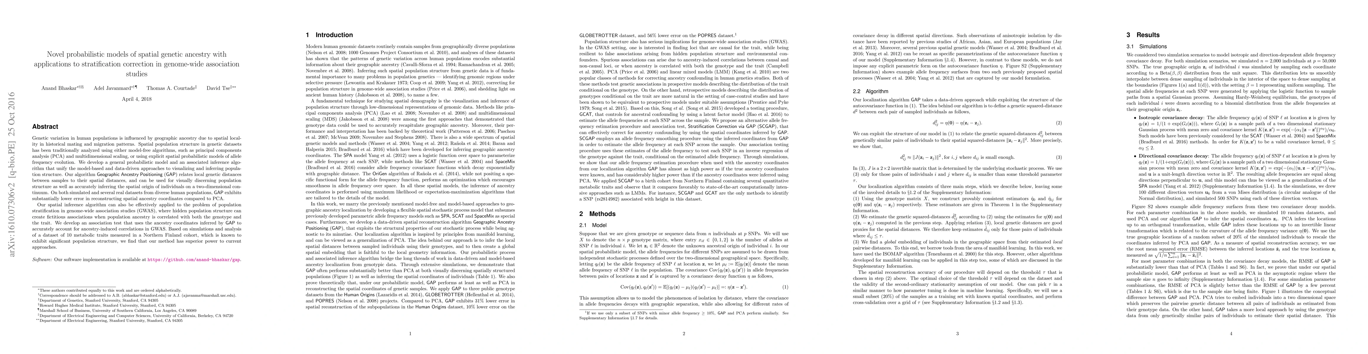 This paper introduces a novel probabilistic model called Geographic Ancestry Positioning (GAP) for visualizing and inferring spatial population structure, which outperforms traditional PCA in reconstructing spatial ancestry coordinates. The GAP model is also applied to correct for population stratification in genome-wide association studies, demonstrating superior power in detecting true associations compared to existing methods.