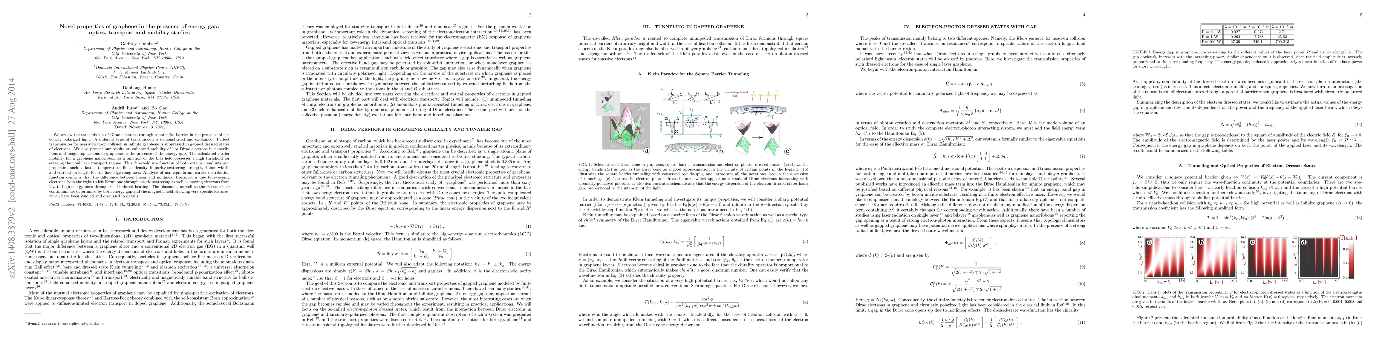 This paper reviews the novel optical, transport, and mobility properties of graphene with an energy gap, revealing suppressed perfect transmission in gapped states and enhanced mobility in nanoribbons. It also explores magnetoplasmons influenced by both the energy gap and magnetic field, detailing their unique characteristics.
