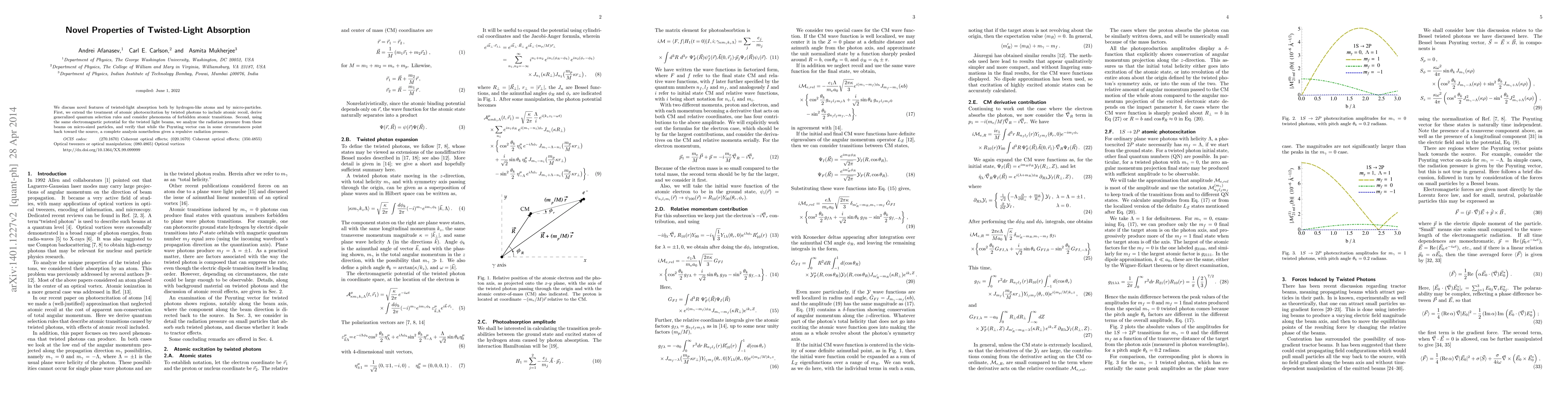 This paper explores novel absorption properties of twisted-light photons by hydrogen-like atoms and micro-particles, deriving generalized quantum selection rules and forbidden transitions, and analyzing the radiation pressure exerted by twisted light on micro-particles, which remains repulsive despite unusual Poynting vector directions.