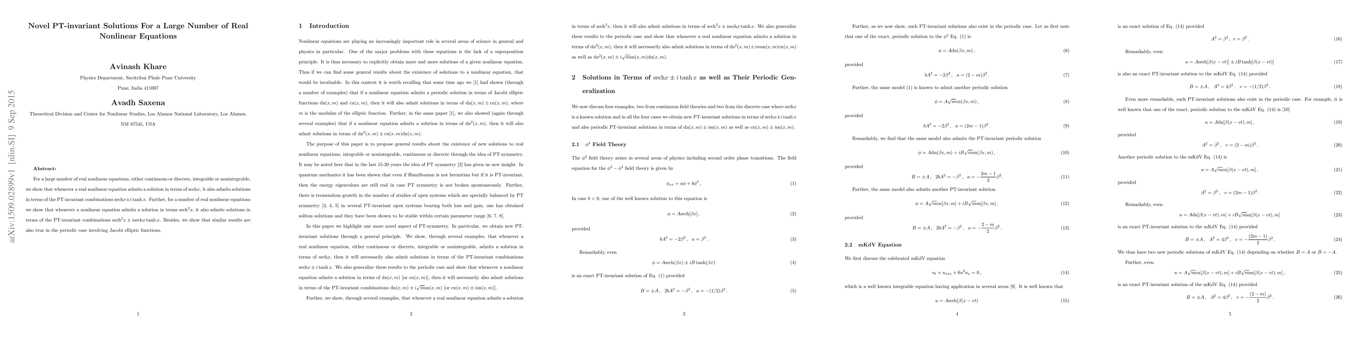This paper explores PT-invariant solutions for numerous real nonlinear equations, demonstrating that if a solution exists in terms of $\sech x$, it also extends to PT-invariant combinations $\sech x \pm i \tanh x$. Additionally, it shows that solutions in terms of $\sech^2 x$ can be extended to PT-invariant combinations $\sech^2 x \pm i \sech x \tanh x$, with similar results applying to periodic cases involving Jacobi elliptic functions.