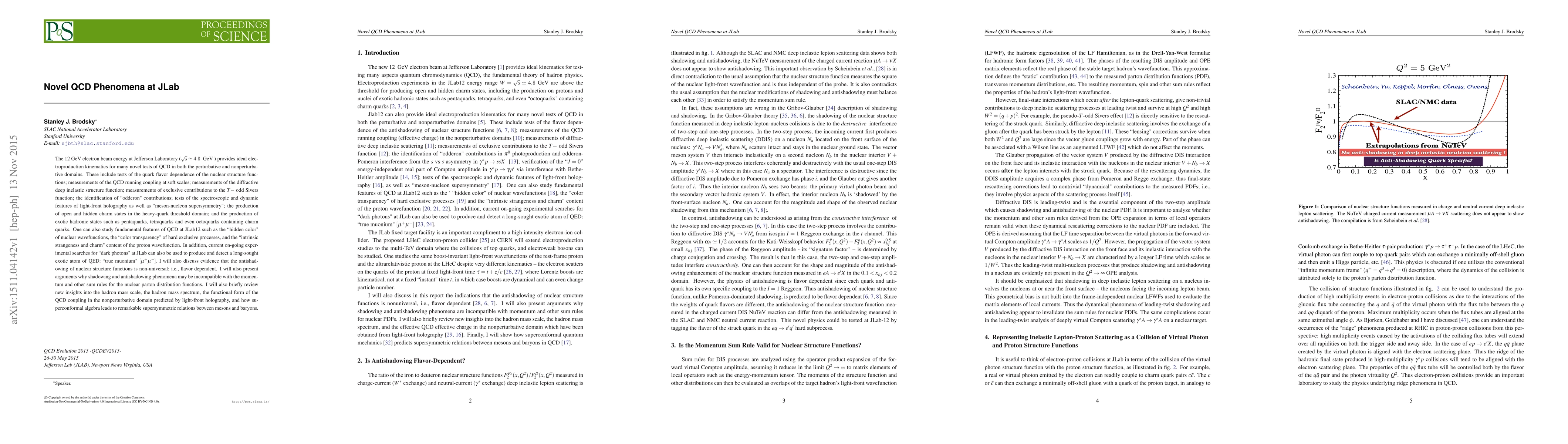 The $12~$GeV electron beam energy at Jefferson Laboratory provides ideal electroproduction kinematics for many novel tests of QCD in both the perturbative and nonperturbative domains. These include tests of the quark flavor dependence of the nuclear structure functions; measurements of the QCD running coupling at soft scales; measurements of the diffractive deep inelastic structure function; measurements of exclusive contributions to the $T-$ odd Sivers function; the identification of ``odderon" contributions; tests of the spectroscopic and dynamic features of light-front holography, as well as ``meson-nucleon supersymmetry"; the production of open and hidden charm states in the heavy-quark threshold domain; and the production of exotic hadronic states such as pentaquarks, tetraquarks and even octoquarks containing charm quarks. One can also study fundamental features of QCD at JLab$12$ such as the ``hidden color" of nuclear wavefunctions, the ``color transparency" of hard exclusive processes, and the ``intrinsic strangeness and charm" content of the proton wavefunction. I will also discuss evidence that the antishadowing of nuclear structure functions is non-universal; i.e., flavor dependent. I will also present arguments why shadowing and antishadowing phenomena may be incompatible with the momentum and other sum rules for the nuclear parton distribution functions. I will also briefly review new insights into the hadron mass scale, the hadron mass spectrum, the functional form of the QCD coupling in the nonperturbative domain predicted by light-front holography, and how superconformal algebra leads to remarkable supersymmetric relations between mesons and baryons.