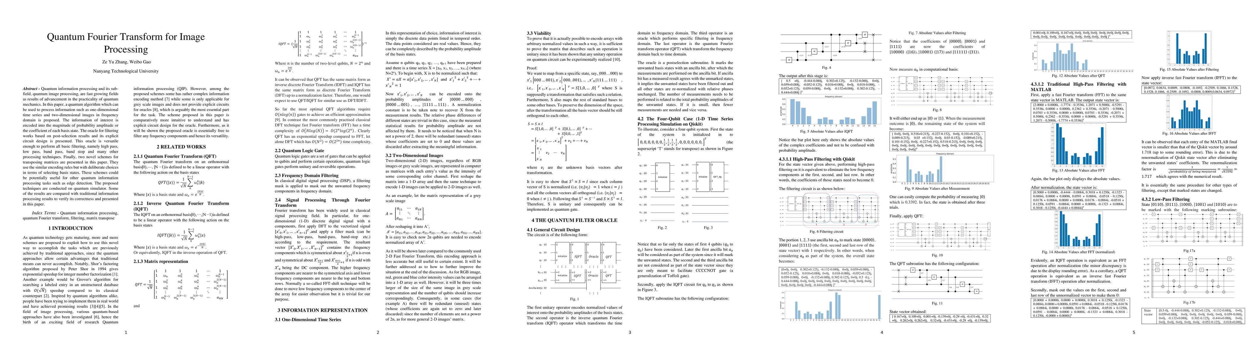 This paper proposes a quantum algorithm for processing one-dimensional time series and two-dimensional images using frequency domain techniques, featuring an oracle for versatile filtering and novel matrix transposition schemes, all implemented on IBM Qiskit. Results are compared with traditional methods to validate the effectiveness of the proposed quantum information processing methods.