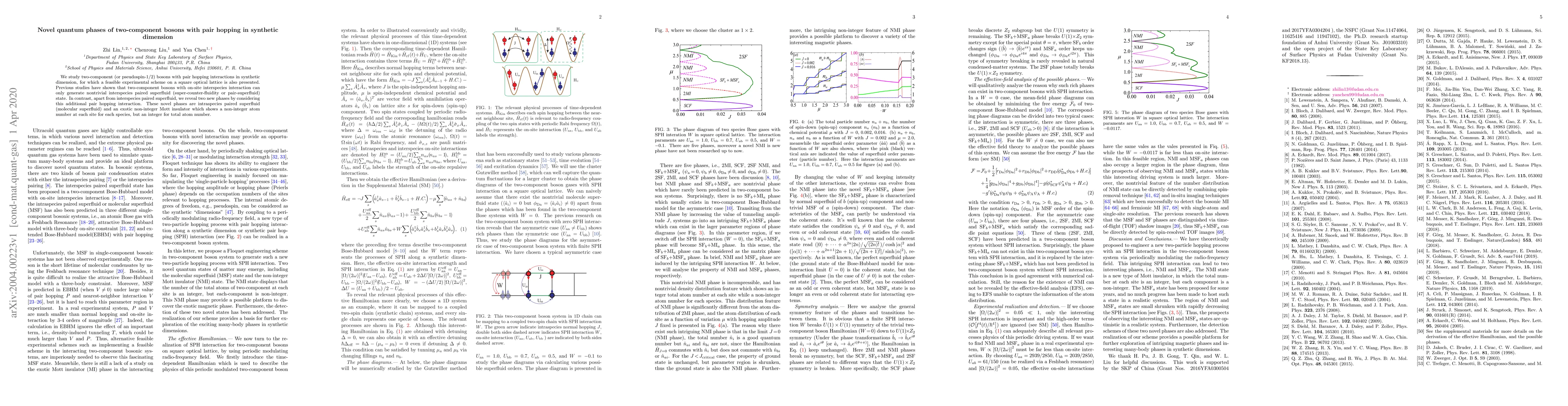 We study two-component (or pseudospin-1/2) bosons with pair hopping interactions in synthetic dimension, for which a feasible experimental scheme on a square optical lattice is also presented. Previous studies have shown that two-component bosons with on-site interspecies interaction can only generate nontrivial interspecies paired superfluid (super-counter-fluidity or pair-superfluid) state. In contrast, apart from interspecies paired superfluid, we reveal two new phases by considering this additional pair hopping interaction. These novel phases are intraspecies paired superfluid (molecular superfluid) and an exotic non-integer Mott insulator which shows a non-integer atom number at each site for each species, but an integer for total atom number.