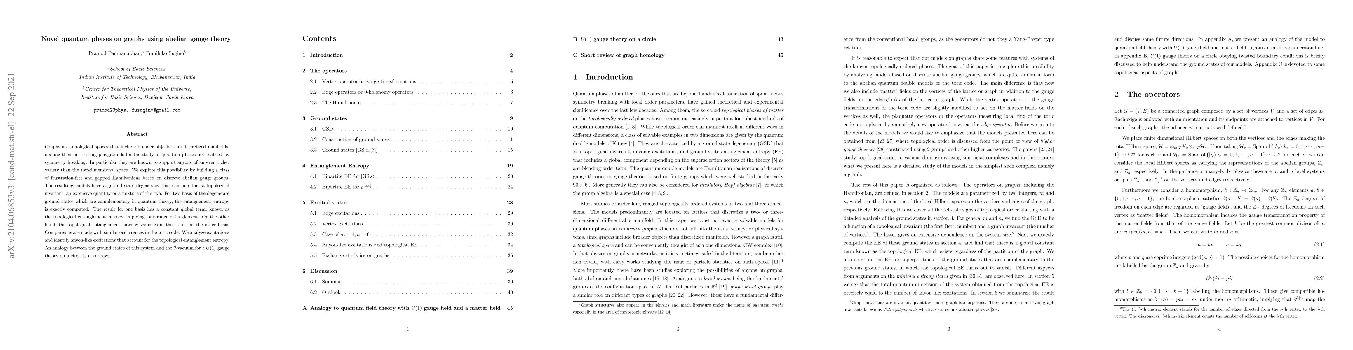 Graphs are topological spaces that include broader objects than discretized manifolds, making them interesting playgrounds for the study of quantum phases not realized by symmetry breaking. In particular they are known to support anyons of an even richer variety than the two-dimensional space. We explore this possibility by building a class of frustration-free and gapped Hamiltonians based on discrete abelian gauge groups. The resulting models have a ground state degeneracy that can be either a topological invariant, an extensive quantity or a mixture of the two. For two basis of the degenerate ground states which are complementary in quantum theory, the entanglement entropy is exactly computed. The result for one basis has a constant global term, known as the topological entanglement entropy, implying long-range entanglement. On the other hand, the topological entanglement entropy vanishes in the result for the other basis. Comparisons are made with similar occurrences in the toric code. We analyze excitations and identify anyon-like excitations that account for the topological entanglement entropy. An analogy between the ground states of this system and the $\theta$-vacuum for a $U(1)$ gauge theory on a circle is also drawn.