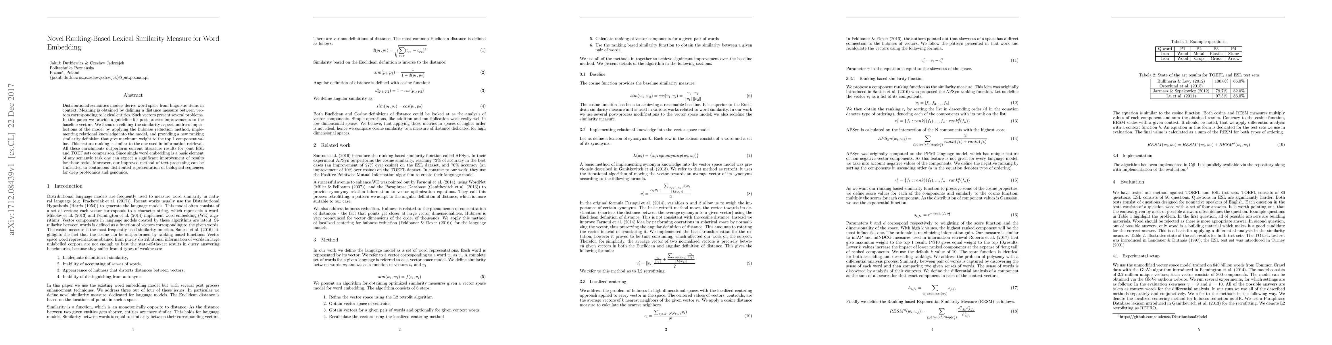 This paper introduces a novel ranking-based lexical similarity measure for word embeddings, refining vector representations through hubness reduction, relational knowledge implementation, and a new ranking similarity definition. These enhancements outperform existing methods and show potential for broader applications in proteomics and genomics.