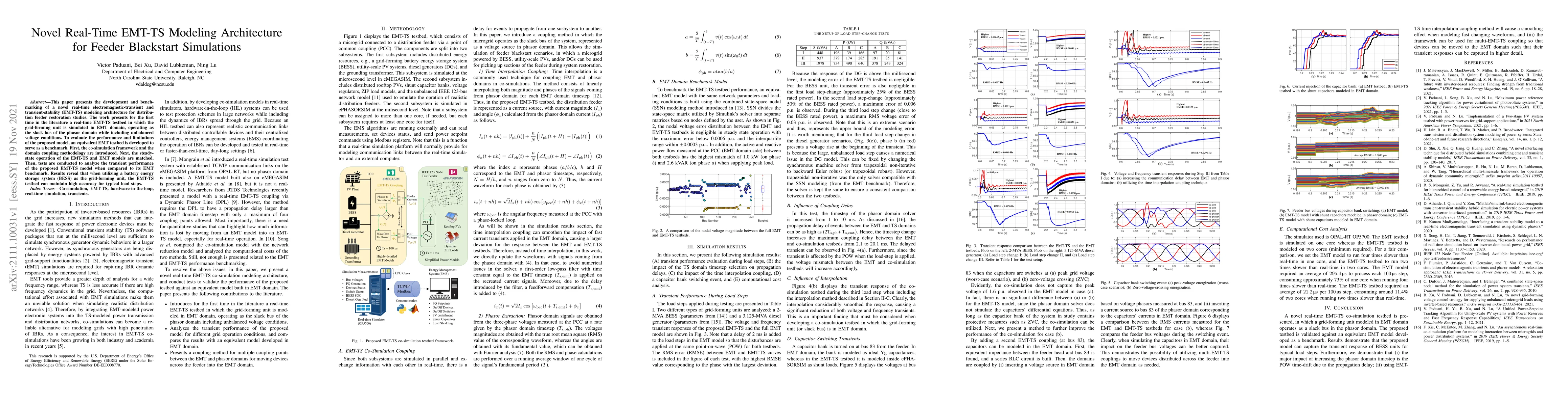 This paper introduces a novel real-time EMT-TS modeling architecture for feeder blackstart simulations, featuring a grid-forming unit operating as the slack bus in the phasor domain. Benchmarking results show high accuracy in transient performance, especially when using a BESS, compared to an equivalent EMT testbed.
