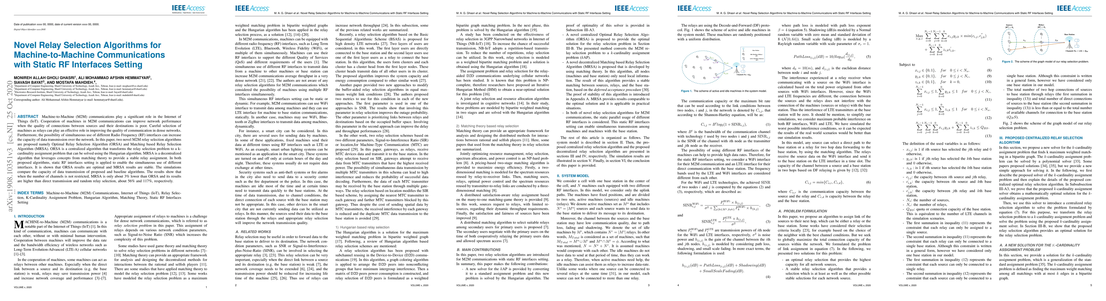 Machine-to-Machine (M2M) communications have been introduced to improve the communication capacity in dense wireless networks. One of the most important concerns for network designers is maintaining the high performance of the network when the quality of connections between sources and their destinations is poor. Thus the careful selection of relays between data sources and their destinations is a very important issue. The possibility of simultaneous use of different Radio Frequency (RF) interfaces for transmitting data, which communication devices are equipped with them, can increase the capacity of data transmission over the network. In this paper, two novel M2M relay selection algorithms are proposed, named as Optimal Relay Selection Algorithm (ORSA) and Matching based Relay Selection Algorithm (MRSA). ORSA is a centralized algorithm for the optimal selection of relays by transforming the main problem to a k-cardinality assignment problem that can be solved using the Hungarian algorithm. MRSA is a distributed algorithm that leverages concepts from matching theory to provide a stable solution for the relay selection problem. In both proposed algorithms static RF interfaces usage is applied to enable simultaneous use of different interfaces for data transmission. The simulations show that ORSA is optimally solving the relay selection problem. MRSA has an optimal stable result, that when there is no restriction on the number of channels, is only about 1% lower than ORSA. Besides, MRSA provides better results than direct transmission Without any Relay Selection Algorithm (WRSA) and Random Relay Selection Algorithm (RRSA), about 15% and 98%, respectively.