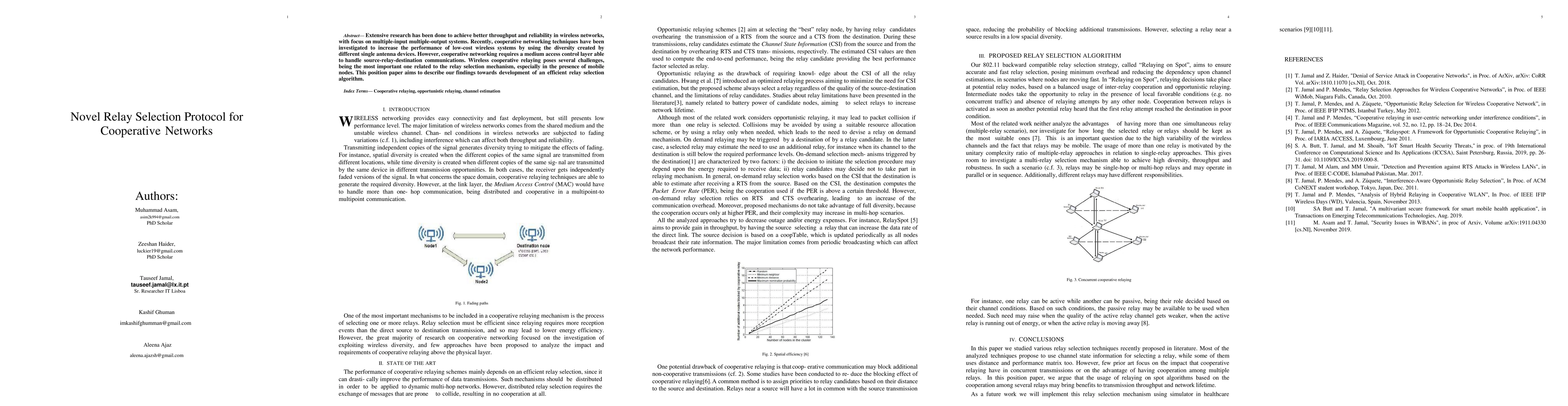This paper proposes a novel relay selection protocol to enhance throughput and reliability in cooperative wireless networks, addressing the challenges of relay selection in mobile environments and leveraging diversity from single antenna devices. The developed algorithm aims to improve performance in low-cost wireless systems.