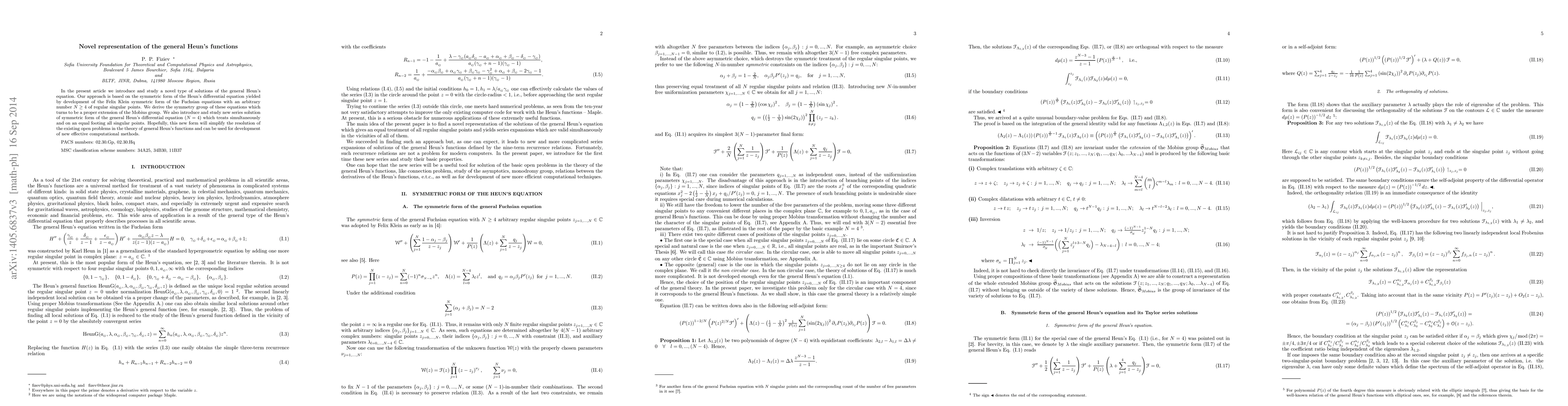 In the present article we introduce and study a novel type of solutions of the general Heun's equation. Our approach is based on the symmetric form of the Heun's differential equation yielded by development of the Felix Klein symmetric form of the Fuchsian equations with an arbitrary number $N\geq 4$ of regular singular points. We derive the symmetry group of these equations which turns to be a proper extension of the Mobius group. We also introduce and study new series solution of symmetric form of the general Heun's differential equation (N=4) which treats simultaneously and on an equal footing all singular points. Hopefully, this new form will simplify the resolution of the existing open problems in the theory of general Heun's functions and can be used for development of new effective computational methods.