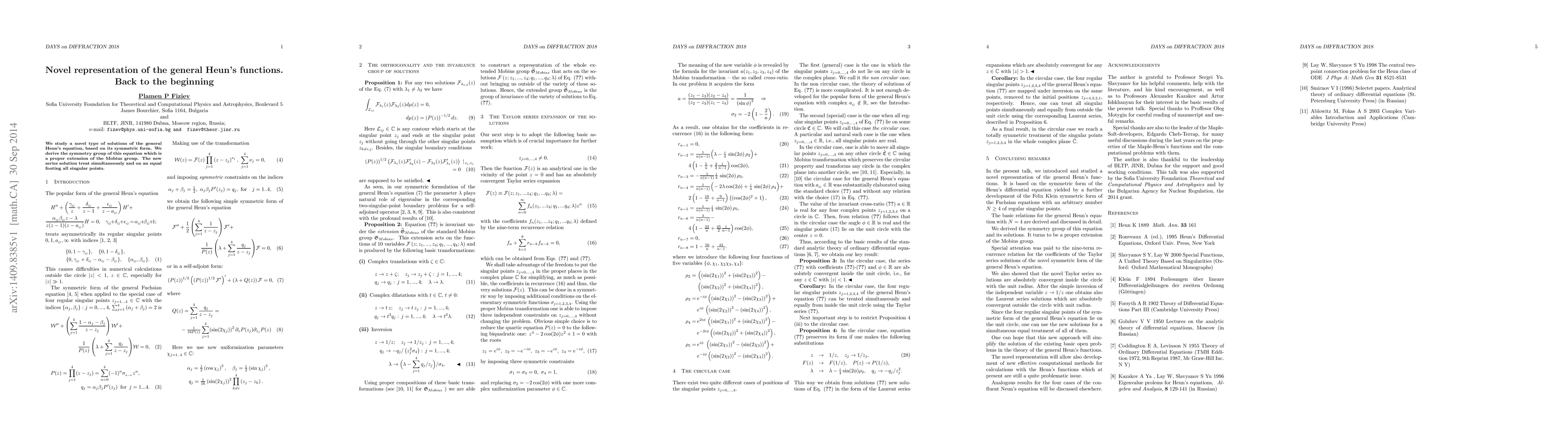 Summary: This paper introduces a novel representation of general Heun's functions using their symmetric form, deriving a symmetry group that extends the Mobius group, and presenting a new series solution that treats all singular points equally.