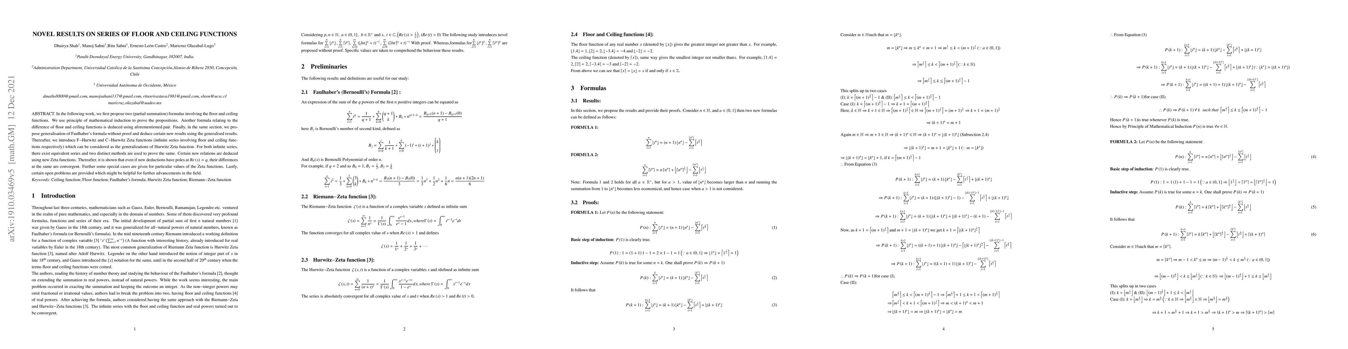 This paper proposes new mathematical formulas involving floor and ceiling functions, including partial summation formulas and a generalization of Faulhaber's formula. It introduces F-Hurwitz and C-Hurwitz Zeta functions, proving their equivalence and deducing new relations, while also showing their convergent differences despite poles.