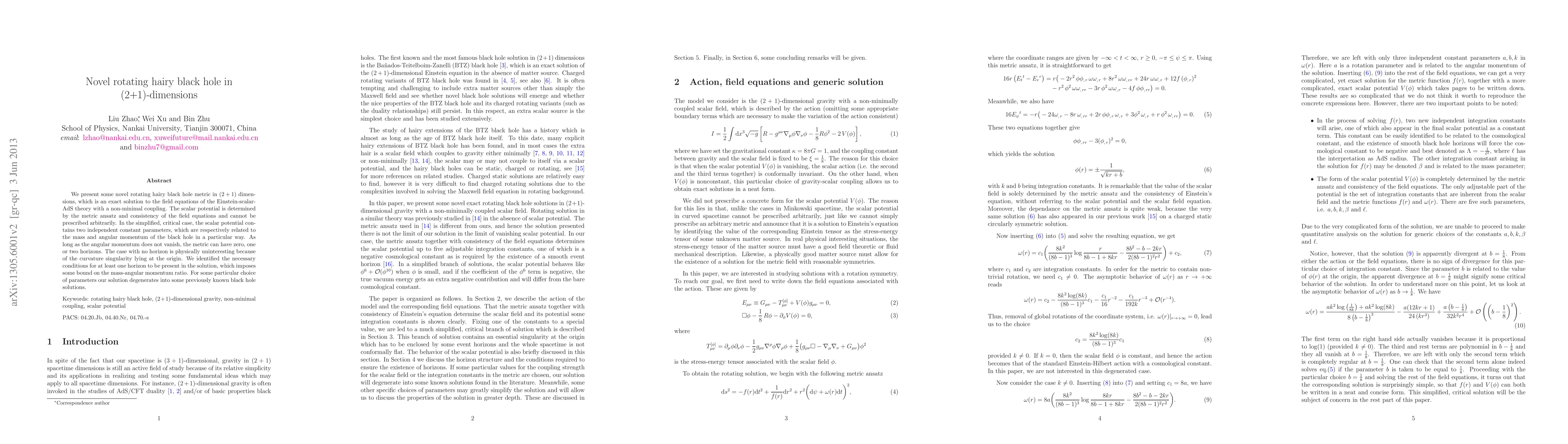 This paper introduces a novel rotating hairy black hole metric in (2+1) dimensions, solving the Einstein-scalar-AdS theory with a non-minimal coupling. The scalar potential is determined by the metric and field equations, leading to a mass-angular momentum ratio bound for at least one horizon.