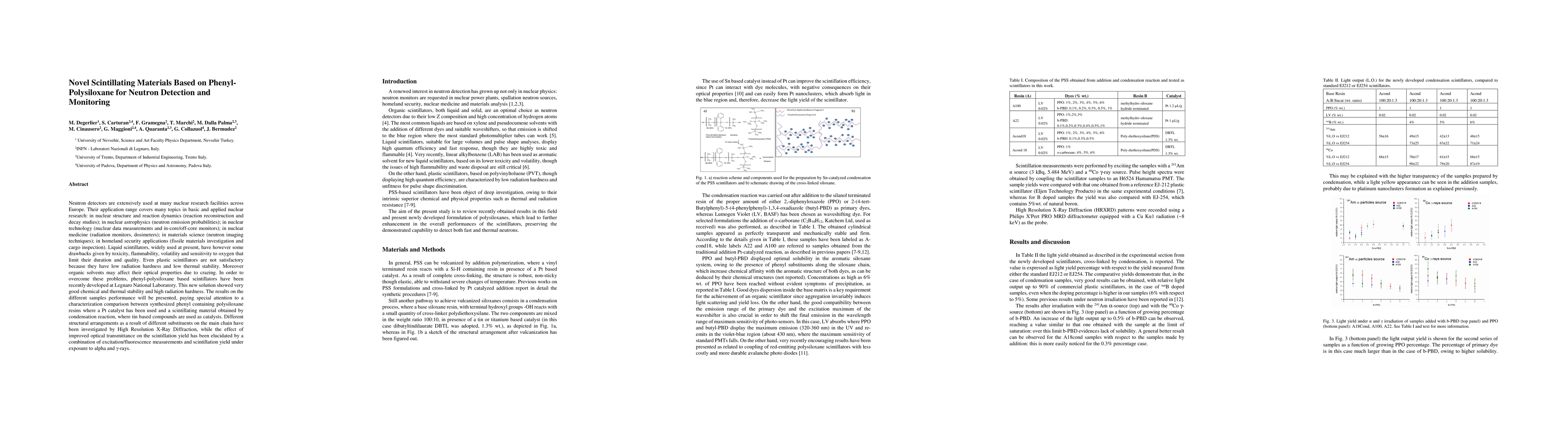Neutron detectors are extensively used at many nuclear research facilities across Europe. Their application range covers many topics in basic and applied nuclear research: in nuclear structure and reaction dynamics (reaction reconstruction and decay studies); in nuclear astrophysics (neutron emission probabilities); in nuclear technology (nuclear data measurements and in-core/off-core monitors); in nuclear medicine (radiation monitors, dosimeters); in materials science (neutron imaging techniques); in homeland security applications (fissile materials investigation and cargo inspection). Liquid scintillators, widely used at present, have however some drawbacks given by toxicity, flammability, volatility and sensitivity to oxygen that limit their duration and quality. Even plastic scintillators are not satisfactory because they have low radiation hardness and low thermal stability. Moreover organic solvents may affect their optical properties due to crazing. In order to overcome these problems, phenyl-polysiloxane based scintillators have been recently developed at Legnaro National Laboratory. This new solution showed very good chemical and thermal stability and high radiation hardness. The results on the different samples performance will be presented, paying special attention to a characterization comparison between synthesized phenyl containing polysiloxane resins where a Pt catalyst has been used and a scintillating material obtained by condensation reaction, where tin based compounds are used as catalysts. Different structural arrangements as a result of different substituents on the main chain have been investigated by High Resolution X-Ray Diffraction, while the effect of improved optical transmittance on the scintillation yield has been elucidated by a combination of excitation/fluorescence measurements and scintillation yield under exposure to alpha and {\gamma}-rays.