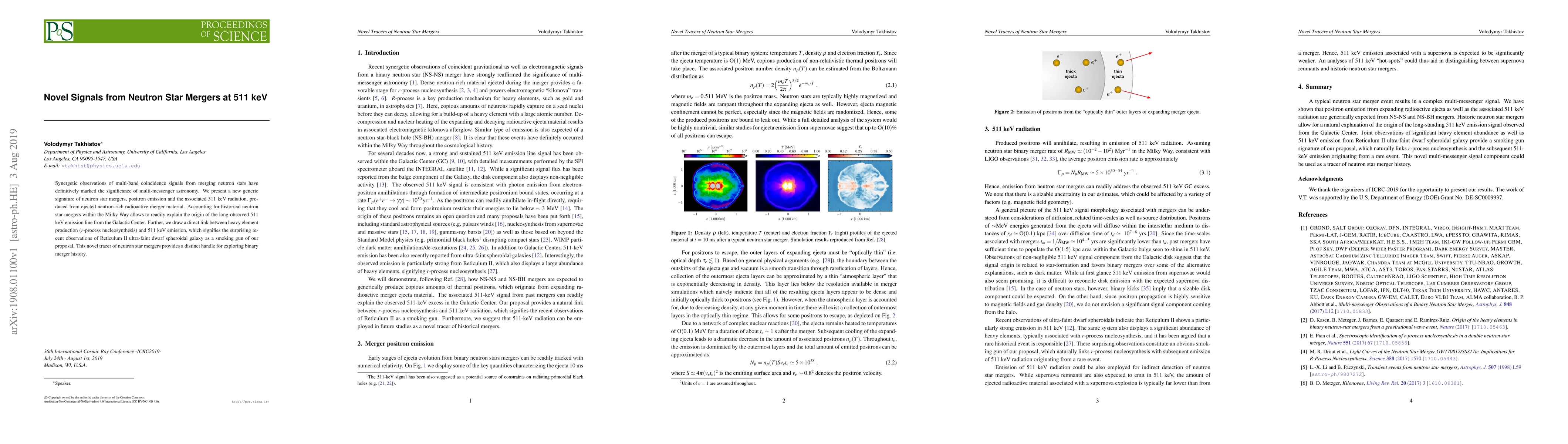 This paper identifies a new signature of neutron star mergers: positron emission leading to 511 keV radiation from ejected neutron-rich material. It links this emission to the Galactic Center's long-observed 511 keV line and the $r$-process nucleosynthesis, supported by observations of Reticulum II.