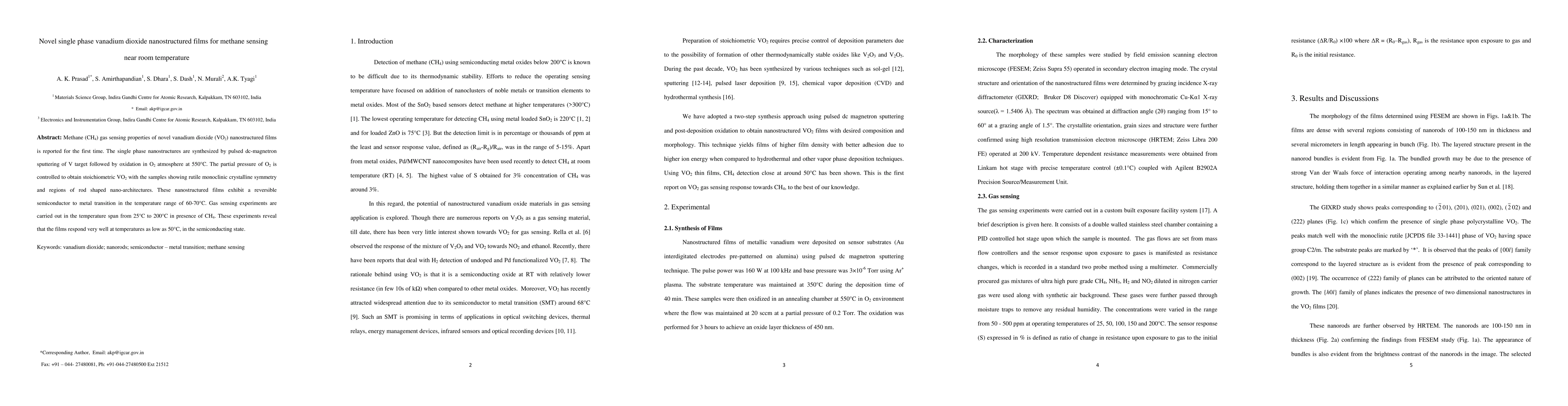 The paper reports on the first methane gas sensing properties of novel vanadium dioxide nanostructured films synthesized via pulsed dc-magnetron sputtering and oxidation. These films show a reversible semiconductor-to-metal transition and effective methane sensing near room temperature at 50°C.