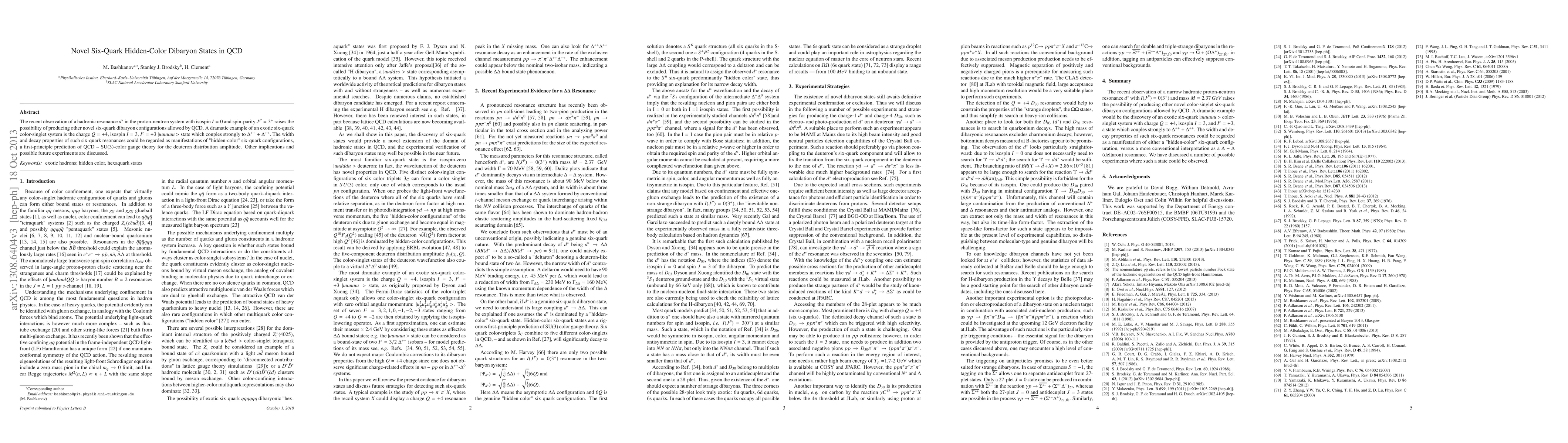 The recent observation of a hadronic resonance $d^*$ in the proton-neutron system with isospin $I = 0$ and spin-parity $J^P = 3^+$ raises the possibility of producing other novel six-quark dibaryon configurations allowed by QCD. A dramatic example of an exotic six-quark color-singlet system is the charge $Q=+4$, isospin I=3, $I^z=+3$ $|uuuuuu>$ state which couples strongly to $\Delta^{++}$ + $\Delta^{++} .$ The width and decay properties of such six-quark resonances could be regarded as manifestations of "hidden-color" six-quark configurations, a first-principle prediction of QCD -- SU(3)-color gauge theory for the deuteron distribution amplitude. Other implications and possible future experiments are discussed.