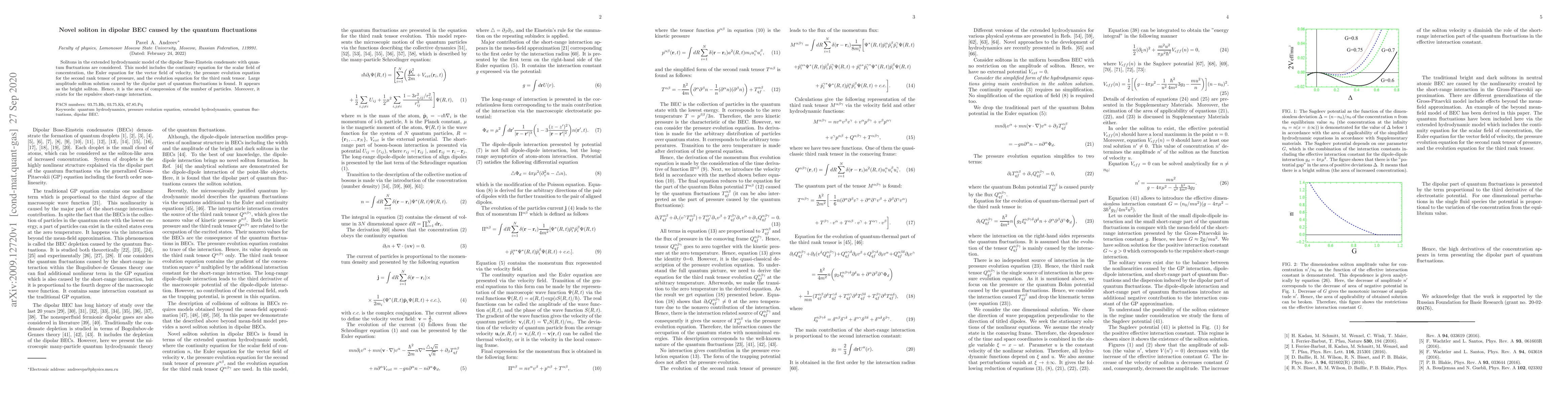 Solitons in the extended hydrodynamic model of the dipolar Bose-Einstein condensate with quantum fluctuations are considered. This model includes the continuity equation for the scalar field of concentration, the Euler equation for the vector field of velocity, the pressure evolution equation for the second rank tensor of pressure, and the evolution equation for the third rank tensor. Large amplitude soliton solution caused by the dipolar part of quantum fluctuations is found. It appears as the bright soliton. Hence, it is the area of compression of the number of particles. Moreover, it exists for the repulsive short-range interaction.