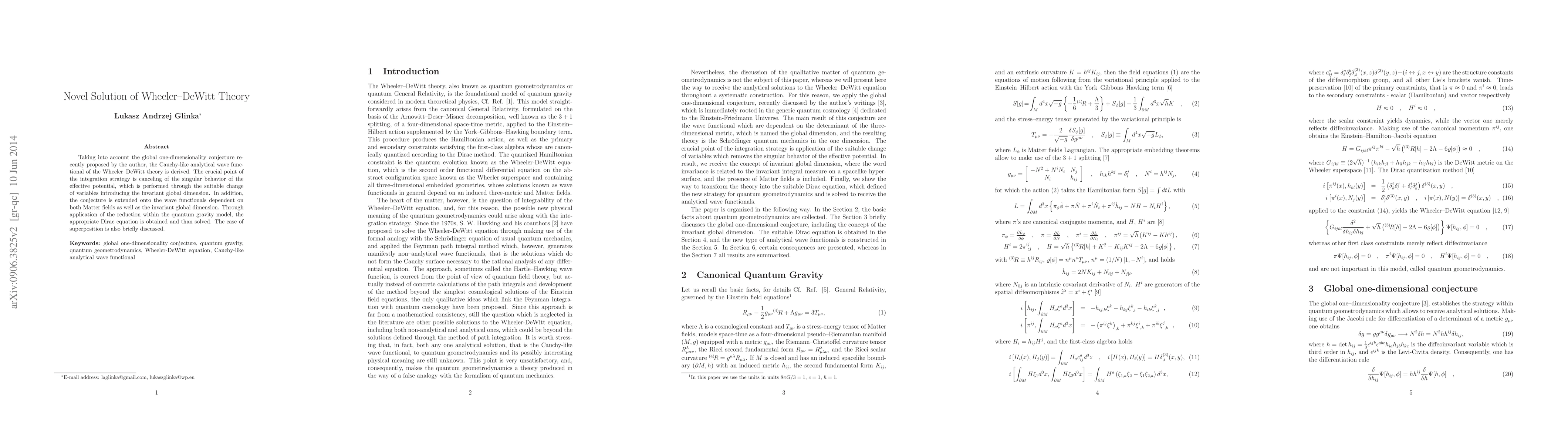 Taking into account the global one-dimensionality conjecture recently proposed by the author, the Cauchy-like analytical wave functional of the Wheeler-DeWitt theory is derived. The crucial point of the integration strategy is canceling of the singular behavior of the effective potential, which is performed through the suitable change of variables introducing the invariant global dimension. In addition, the conjecture is extended onto the wave functionals dependent on both Matter felids as well as the invariant global dimension. Through application of the reduction within the quantum gravity model, the appropriate Dirac equation is obtained and than solved. The case of superposition is also briey discussed.