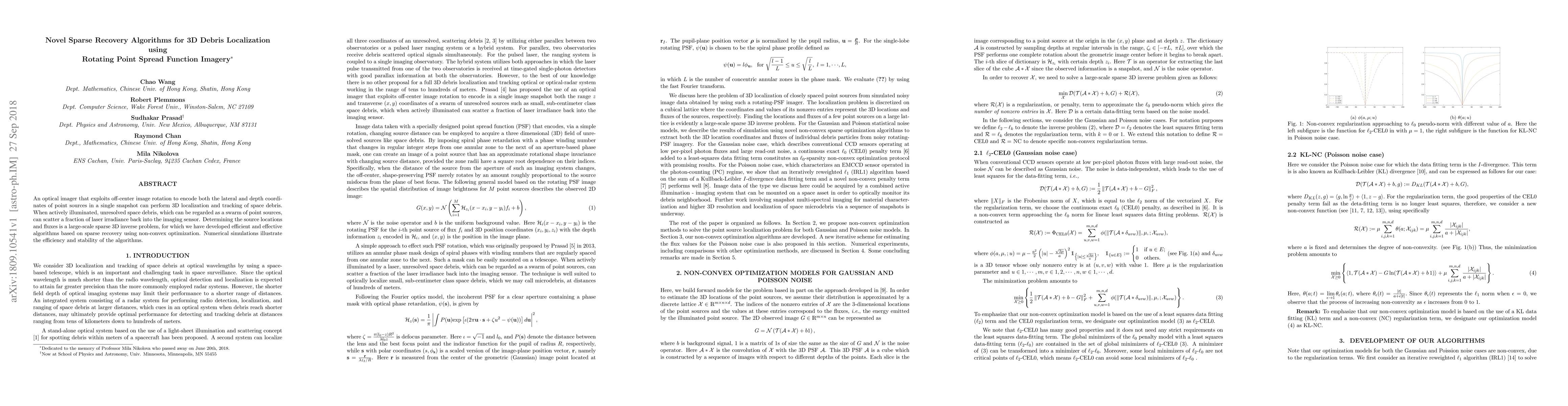 This paper presents novel sparse recovery algorithms for 3D localization of space debris using rotating point spread function imagery, leveraging non-convex optimization to solve the large-scale sparse inverse problem. Numerical simulations demonstrate the efficiency and stability of the proposed algorithms.