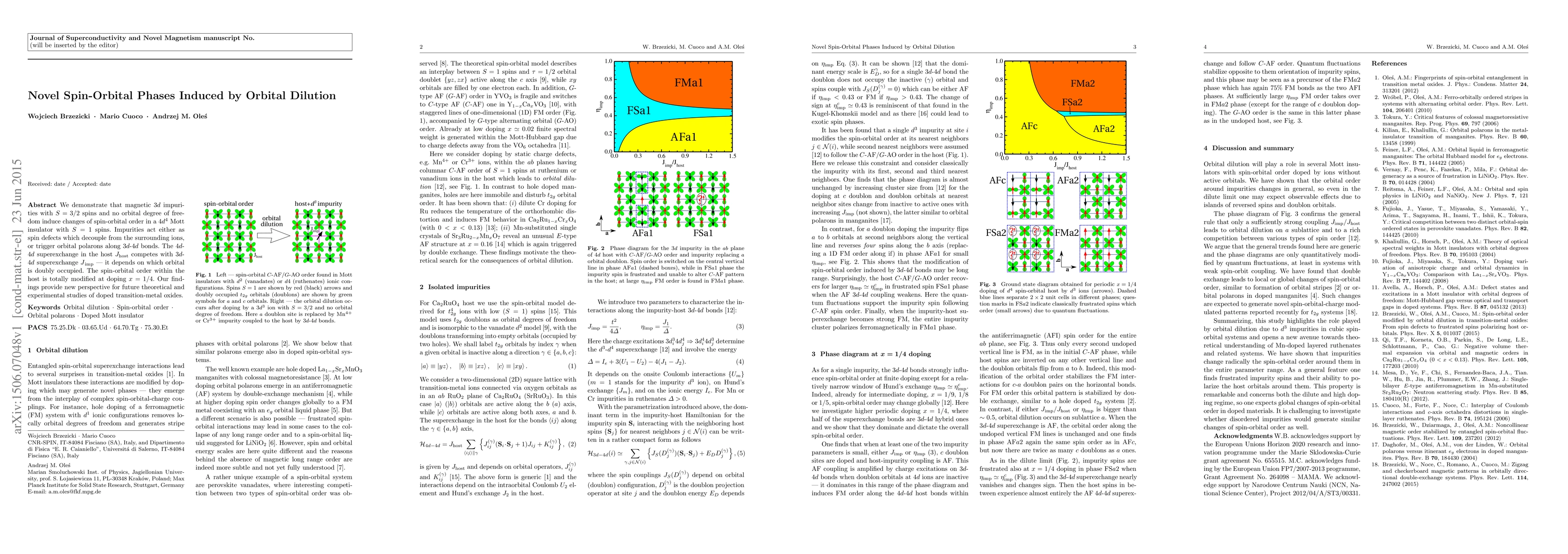 We demonstrate that magnetic $3d$ impurities with $S=3/2$ spins and no orbital degree of freedom induce changes of spin-orbital order in a $4d^4$ Mott insulator with $S=1$ spins. Impurities act either as spin defects which decouple from the surrounding ions, or trigger orbital polarons along $3d$-$4d$ bonds. The $4d$-$4d$ superexchange in the host $J_{\rm host}$ competes with $3d$-$4d$ superexchange $J_{\rm imp}$ --- it depends on which orbital is doubly occupied. The spin-orbital order within the host is totally modified at doping $x=1/4$. Our findings provide new perspective for future theoretical and experimental studies of doped transition-metal oxides.