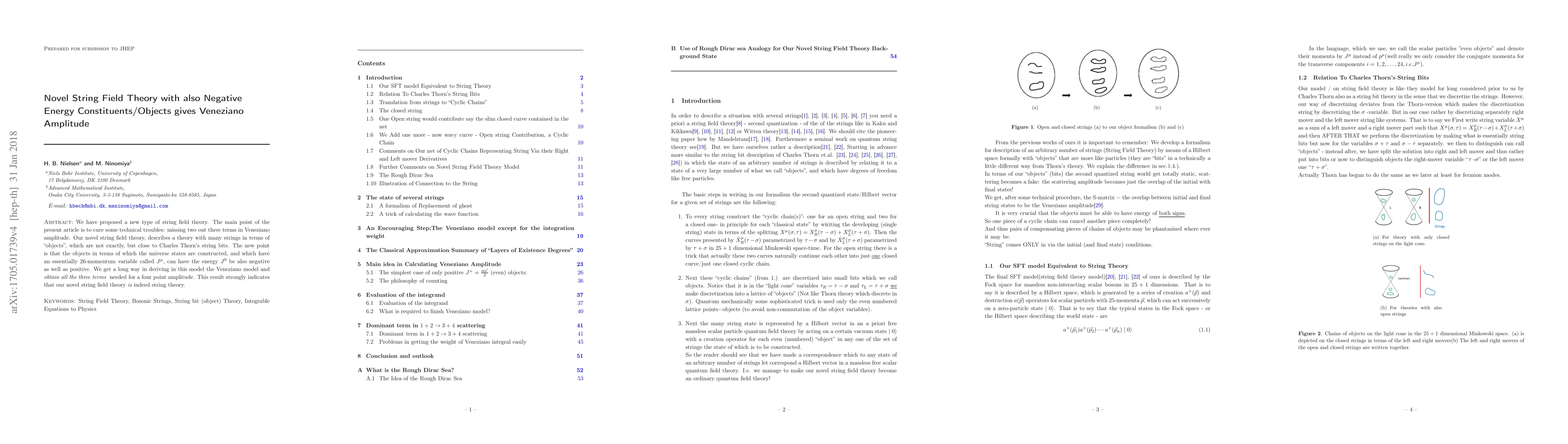 We have proposed a new type of string field theory. The main point of the present article is to cure some technical troubles: missing two out three terms in veneziano amplitude. Our novel string field theory, describes a theory with many strings in terms of "objects",which are not exactly, but close to Charles Thorn's string bits. The new point is that the objects in terms of which the universe states are constructed,and which have an essentially 26-momentum variable called J^{\mu}, can have essentially the energy J^0 be also negative.We get a long way in deriving in this model the veneziano model and obtain all the three terms needed for a four point amplitude.This result strongly indicates that our novel string field theory is indeed string theory.