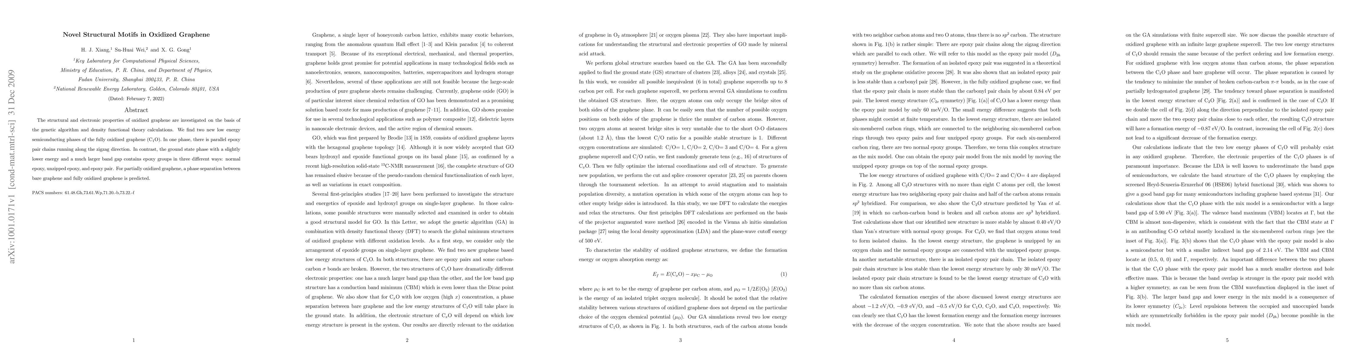 The structural and electronic properties of oxidized graphene are investigated on the basis of the genetic algorithm and density functional theory calculations. We find two new low energy semiconducting phases of the fully oxidized graphene (C1O). In one phase, there is parallel epoxy pair chains running along the zigzag direction. In contrast, the ground state phase with a slightly lower energy and a much larger band gap contains epoxy groups in three different ways: normal epoxy, unzipped epoxy, and epoxy pair. For partially oxidized graphene, a phase separation between bare graphene and fully oxidized graphene is predicted.