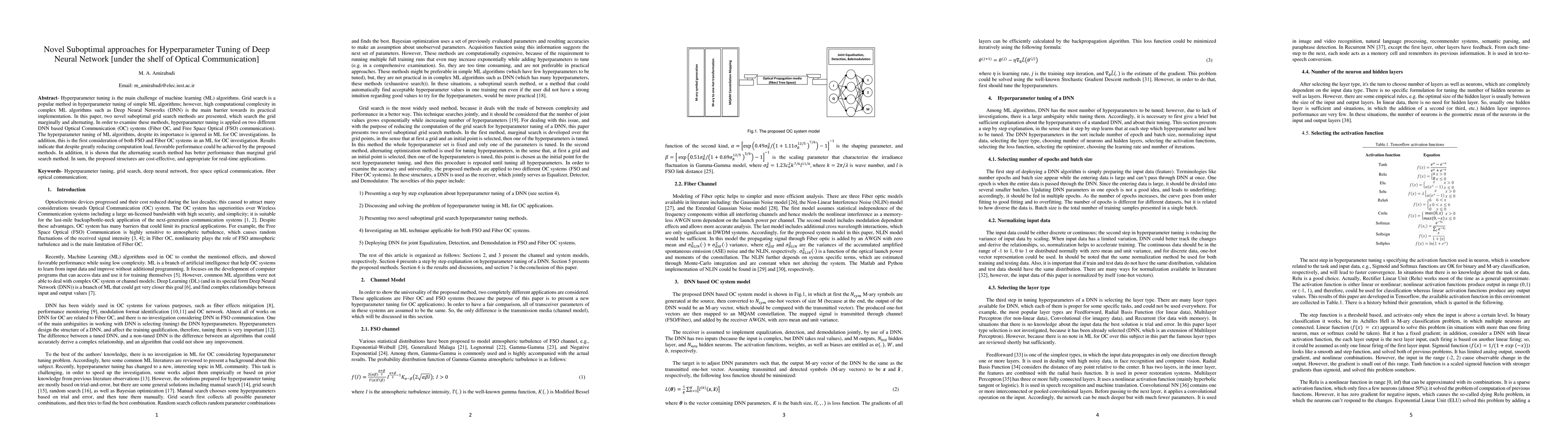 Hyperparameter tuning is the main challenge of machine learning (ML) algorithms. Grid search is a popular method in hyperparameter tuning of simple ML algorithms; however, high computational complexity in complex ML algorithms such as Deep Neural Networks (DNN) is the main barrier towards its practical implementation. In this paper, two novel suboptimal grid search methods are presented, which search the grid marginally and alternating. In order to examine these methods, hyperparameter tuning is applied on two different DNN based Optical Communication (OC) systems (Fiber OC, and Free Space Optical (FSO) communication). The hyperparameter tuning of ML algorithms, despite its importance is ignored in ML for OC investigations. In addition, this is the first consideration of both FSO and Fiber OC systems in an ML for OC investigation. Results indicate that despite greatly reducing computation load, favorable performance could be achieved by the proposed methods. In addition, it is shown that the alternating search method has better performance than marginal grid search method. In sum, the proposed structures are cost-effective, and appropriate for real-time applications.