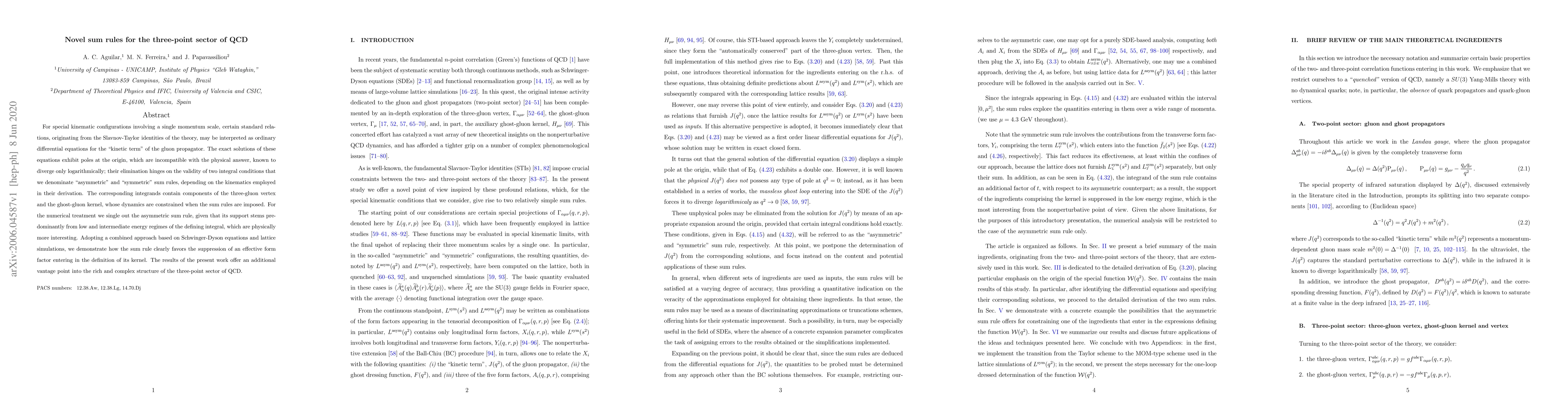 For special kinematic configurations involving a single momentum scale, certain standard relations, originating from the Slavnov-Taylor identities of the theory, may be interpreted as ordinary differential equations for the ``kinetic term'' of the gluon propagator. The exact solutions of these equations exhibit poles at the origin, which are incompatible with the physical answer, known to diverge only logarithmically; their elimination hinges on the validity of two integral conditions that we denominate ``asymmetric'' and ``symmetric'' sum rules, depending on the kinematics employed in their derivation. The corresponding integrands contain components of the three-gluon vertex and the ghost-gluon kernel, whose dynamics are constrained when the sum rules are imposed. For the numerical treatment we single out the asymmetric sum rule, given that its support stems predominantly from low and intermediate energy regimes of the defining integral, which are physically more interesting. Adopting a combined approach based on Schwinger-Dyson equations and lattice simulations, we demonstrate how the sum rule clearly favors the suppression of an effective form factor entering in the definition of its kernel. The results of the present work offer an additional vantage point into the rich and complex structure of the three-point sector of QCD.