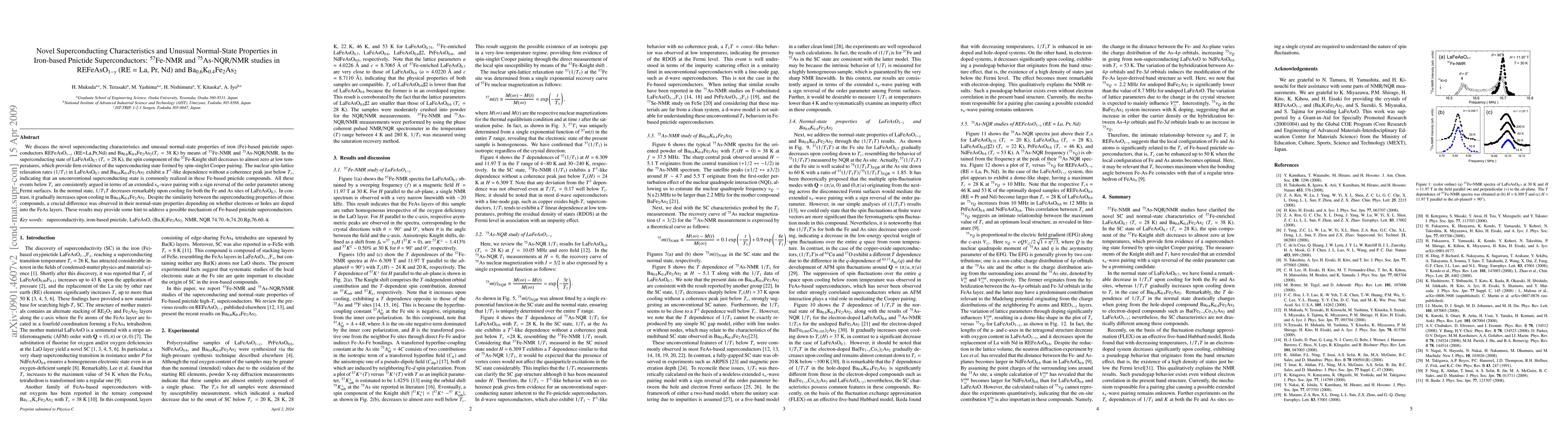 This study investigates novel superconducting characteristics and unusual normal-state properties in iron-based pnictide superconductors using $^{57}$Fe-NMR and $^{75}$As-NQR/NMR. Evidence of spin-singlet Cooper pairing and an unconventional $s_{\pm}$-wave superconducting state is found in REFeAsO$_{1-y}$ (RE=La,Pr,Nd) and Ba$_{0.6}$K$_{0.4}$Fe$_2$As$_2$. Significant differences in normal-state properties are observed depending on doping type, suggesting diverse mechanisms in these superconductors.
