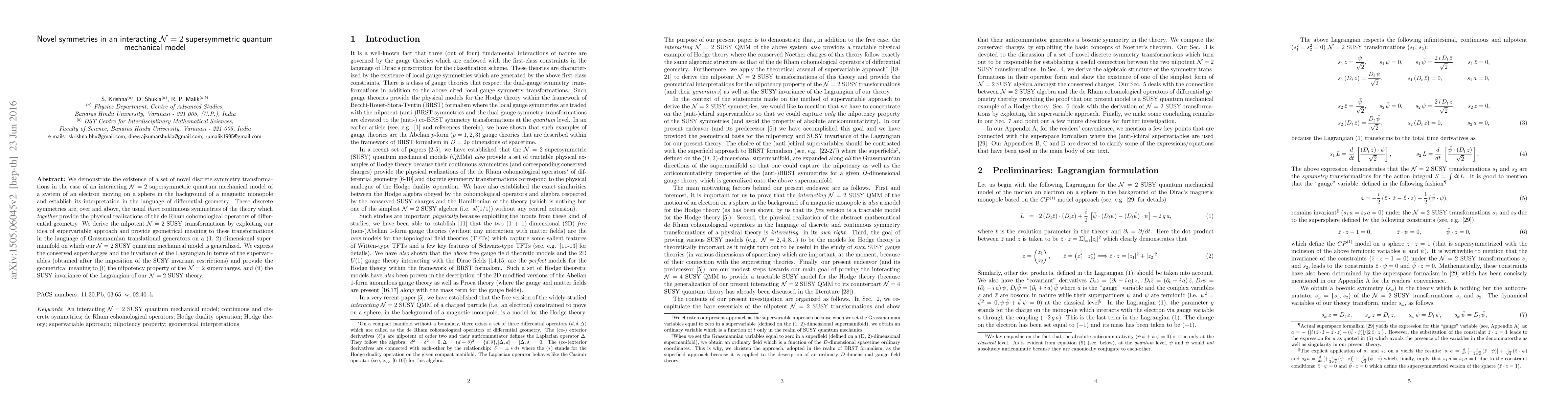 We demonstrate the existence of a set of novel discrete symmetry transformations in the case of an interacting N = 2 supersymmetric quantum mechanical model of a system of an electron moving on a sphere in the background of a magnetic monopole and establish its interpretation in the language of differential geometry. These discrete symmetries are, over and above, the usual three continuous symmetries of the theory which together provide the physical realizations of the de Rham cohomological operators of differential geometry. We derive the nilpotent N = 2 SUSY transformations by exploiting our idea of supervariable approach and provide geometrical meaning to these transformations in the language of Grassmannian translational generators on a (1, 2)-dimensional supermanifold on which our N = 2 SUSY quantum mechanical model is generalized. We express the conserved supercharges and the invariance of the Lagrangian in terms of the supervariables (obtained after the imposition of the SUSY invariant restrictions) and provide the geometrical meaning to (i) the nilpotency property of the N = 2 supercharges, and (ii) the SUSY invariance of the Lagrangian of our N = 2 SUSY theory.