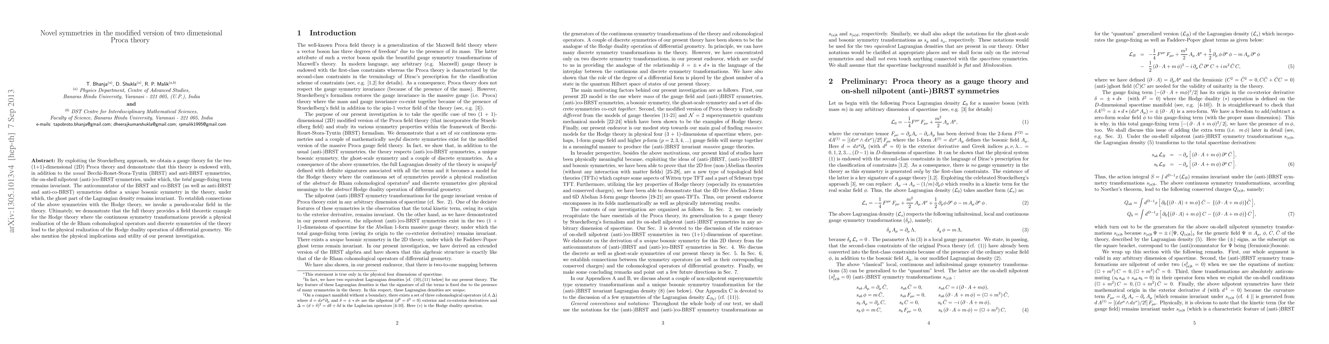 Researchers discovered novel symmetries in a modified 2D Proca theory, including on-shell nilpotent symmetries that connect to Hodge theory, providing a physical realization of de Rham cohomological operators and the Hodge duality operation.