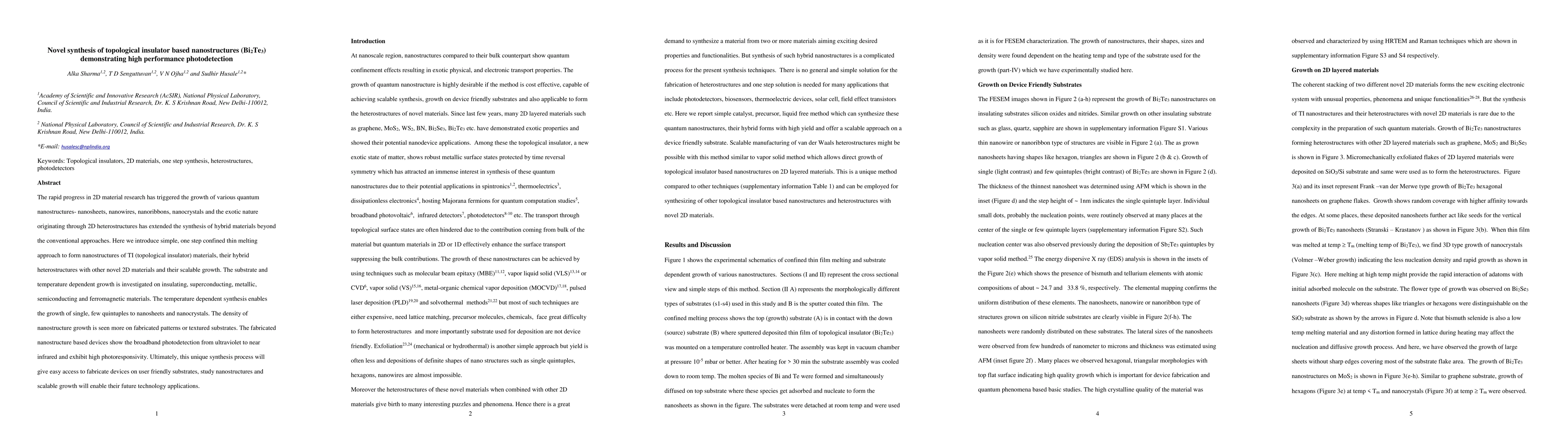 The rapid progress in 2D material research has triggered the growth of various quantum nanostructures-nanosheets, nanowires, nanoribbons, nanocrystals and the exotic nature originating through 2D heterostructures has extended the synthesis of hybrid materials beyond the conventional approaches. Here we introduce simple, one step confined thin melting approach to form nanostructures of TI (topological insulator) materials, their hybrid heterostructures with other novel 2D materials and their scalable growth. The substrate and temperature dependent growth is investigated on insulating, superconducting, metallic, semiconducting and ferromagnetic materials. The temperature dependent synthesis enables the growth of single, few quintuples to nanosheets and nanocrystals. The density of nanostructure growth is seen more on fabricated patterns or textured substrates. The fabricated nanostructure based devices show the broadband photodetection from ultraviolet to near infrared and exhibit high photoresponsivity. Ultimately, this unique synthesis process will give easy access to fabricate devices on user friendly substrates, study nanostructures and scalable growth will enable their future technology applications.